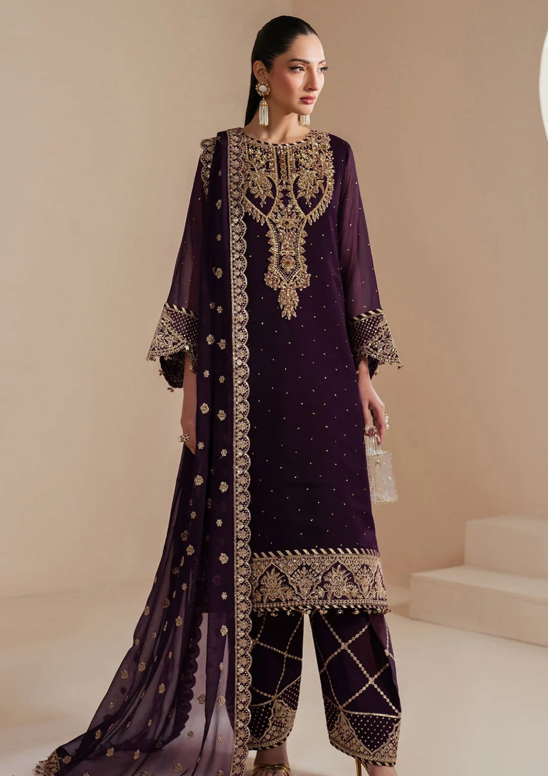 Outfit Type: Eastern Style: Long Shirt Color Type: Deep Purple Package Includes: 3 Piece Top...