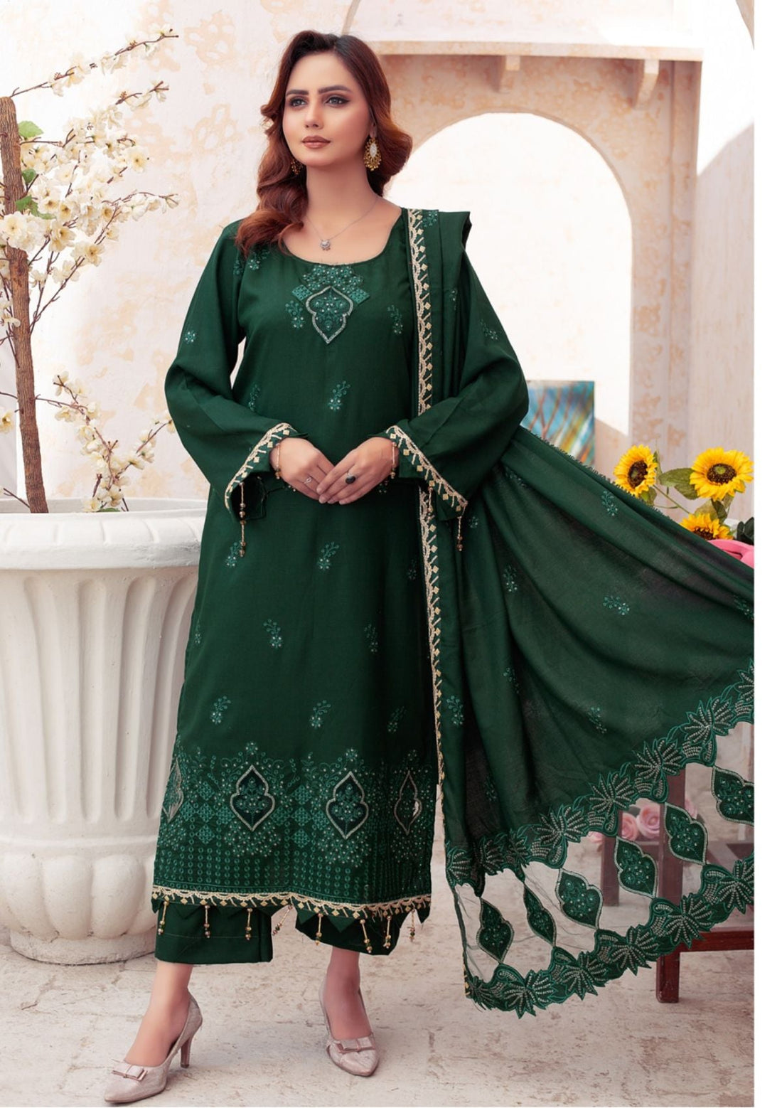 Outfit Type: Eastern Style: Long Shirt Color Type: Green Package Includes: 3 Piece Top ,...
