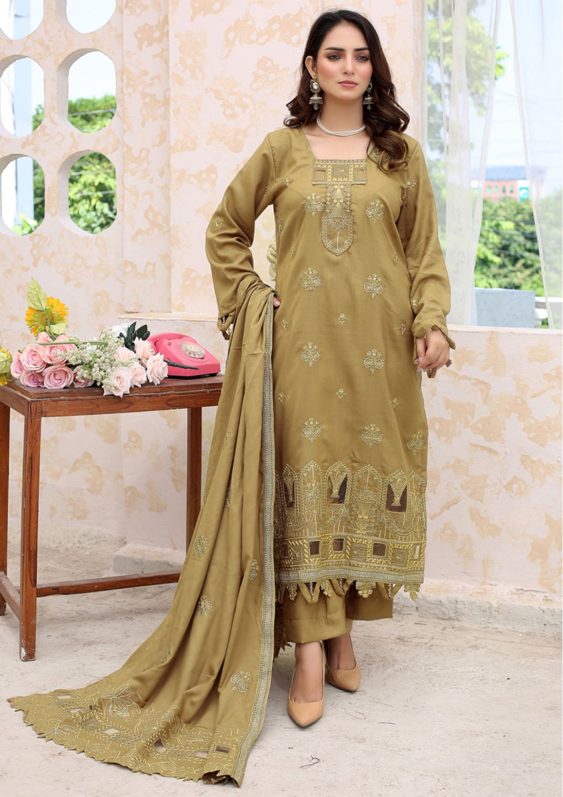 Outfit Type: Eastern Style: Long Shirt Color Type: Mehndi Package Includes: 3 Piece Top ,...