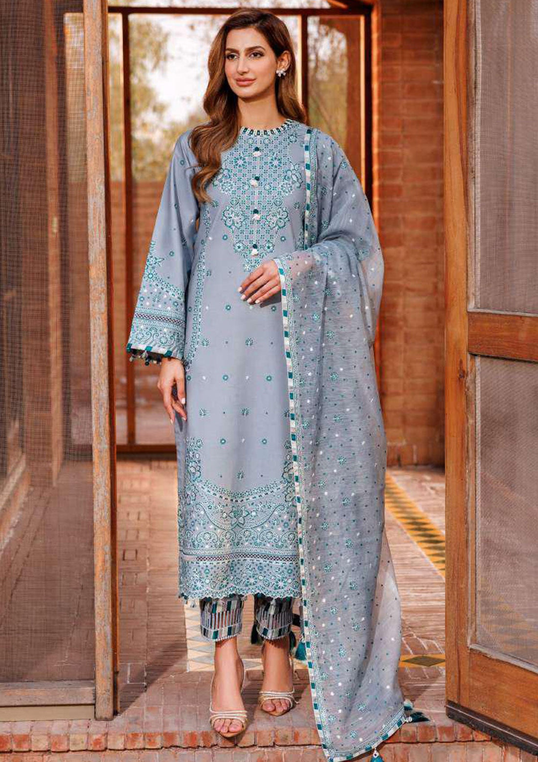 Outfit Type: Eastern Style: Long Shirt Color Type: Ferozi Package Includes: 3 Piece Top ,...
