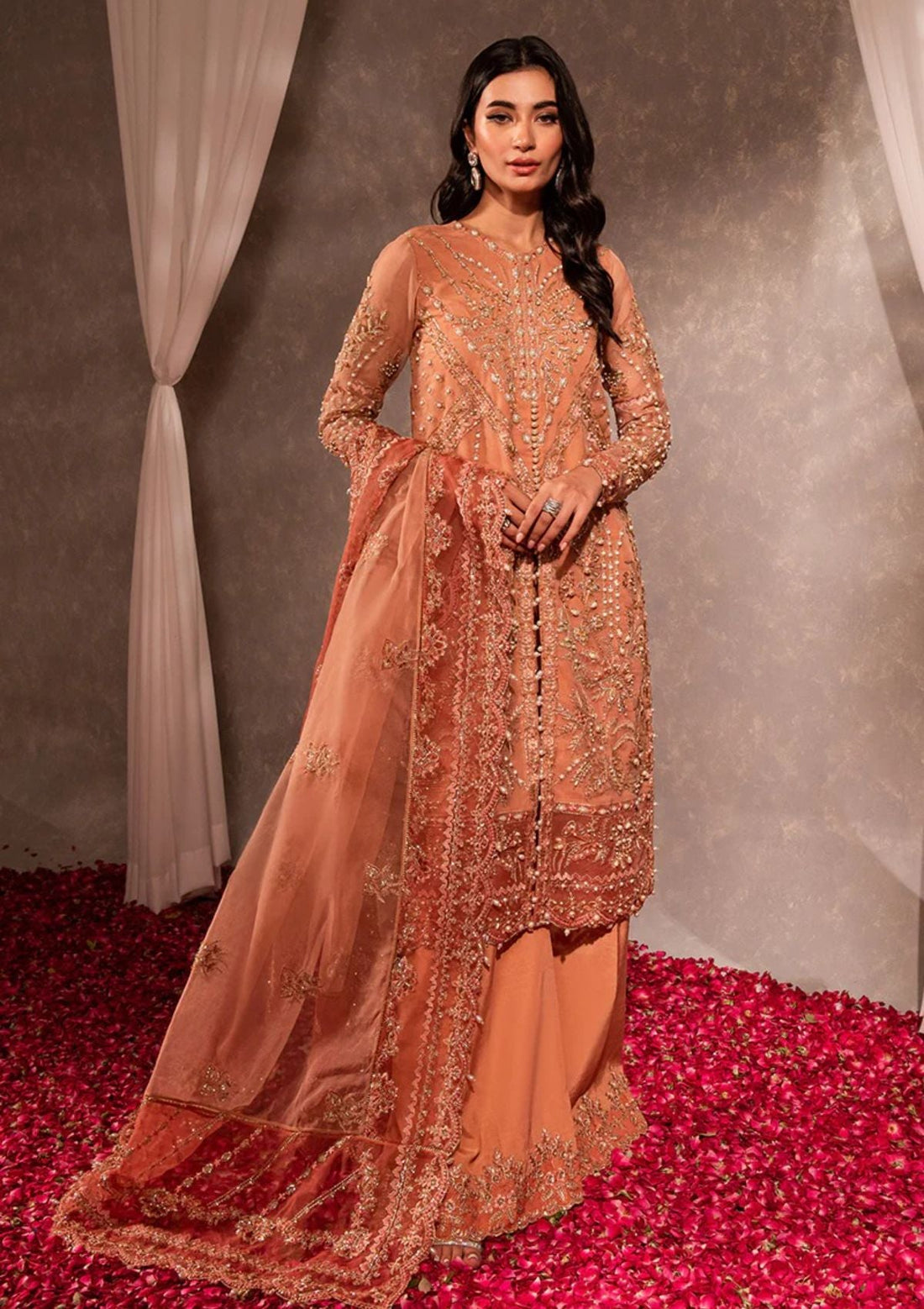 Outfit Type: Eastern Style: Gown Color Type: Peach Package Includes: 3 Piece Top , Bottom...