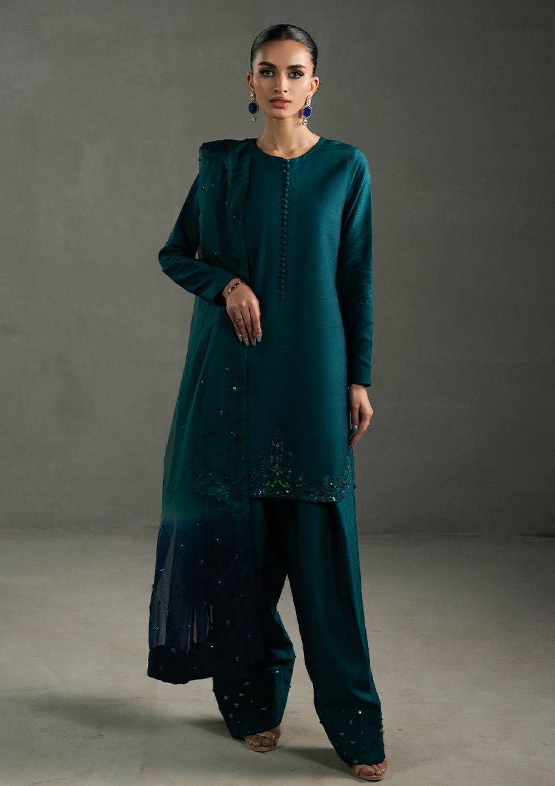 Outfit Type: Eastern Style: Kurta Set Color Type: Teal Package Includes: 3 Piece Top ,...