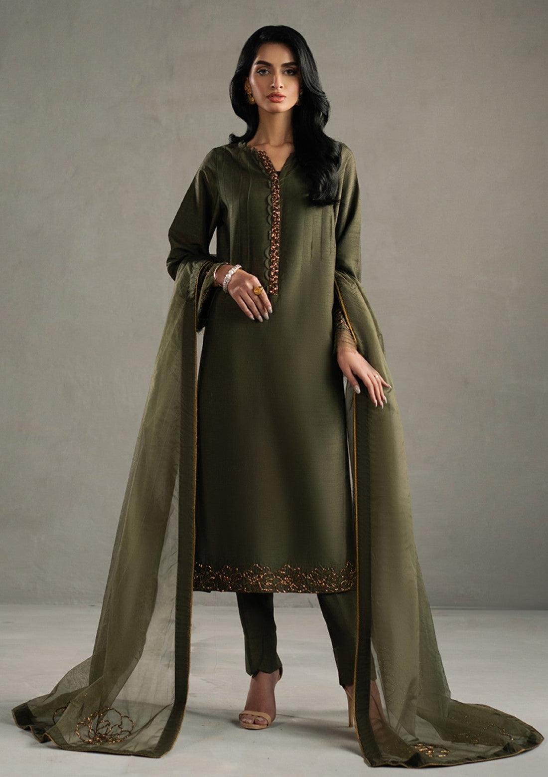 Outfit Type: Eastern Style: Long Shirt Color Type: Mehendi Package Includes: 3 Piece Top ,...
