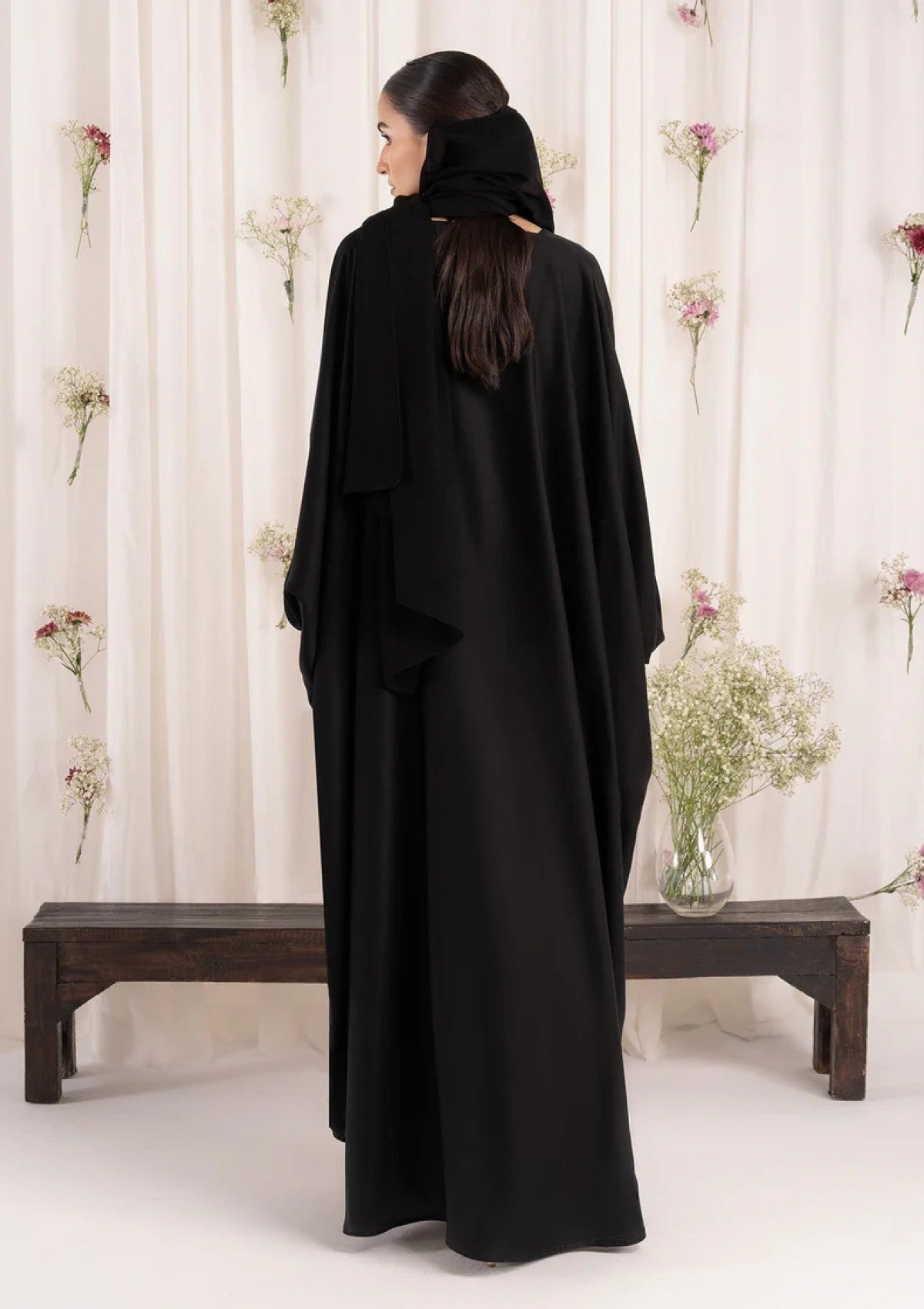 - Discover understated elegance with our simple black nida abaya, featuring a unique touch on the sleeves and paired with a formal chiffon scarf