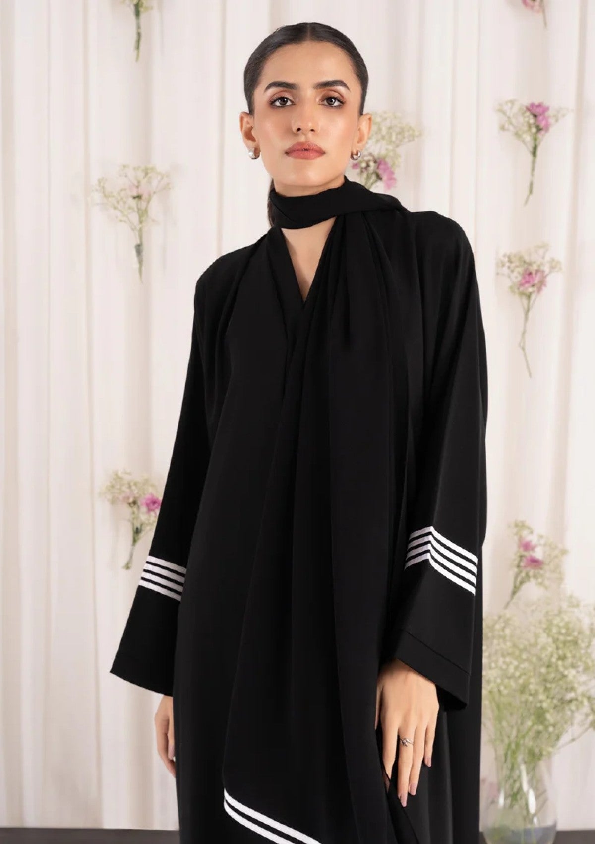 - Experience luxury with our high quality black Korean Nida abaya, adorned with elegant white lines