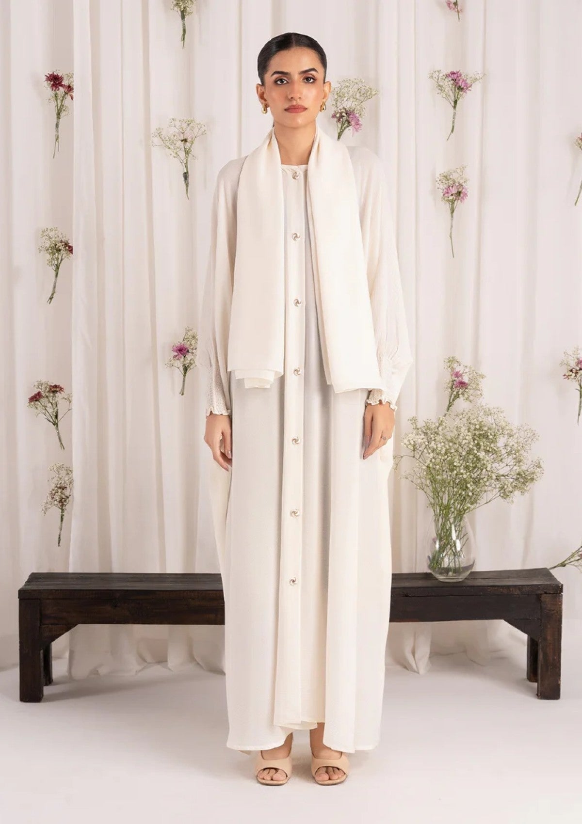 - Elevate your style with our white nida abaya, adorned with beautiful golden and white buttons and stylish shrink sleeves. This design combines classic elegance with a touch of glamour.