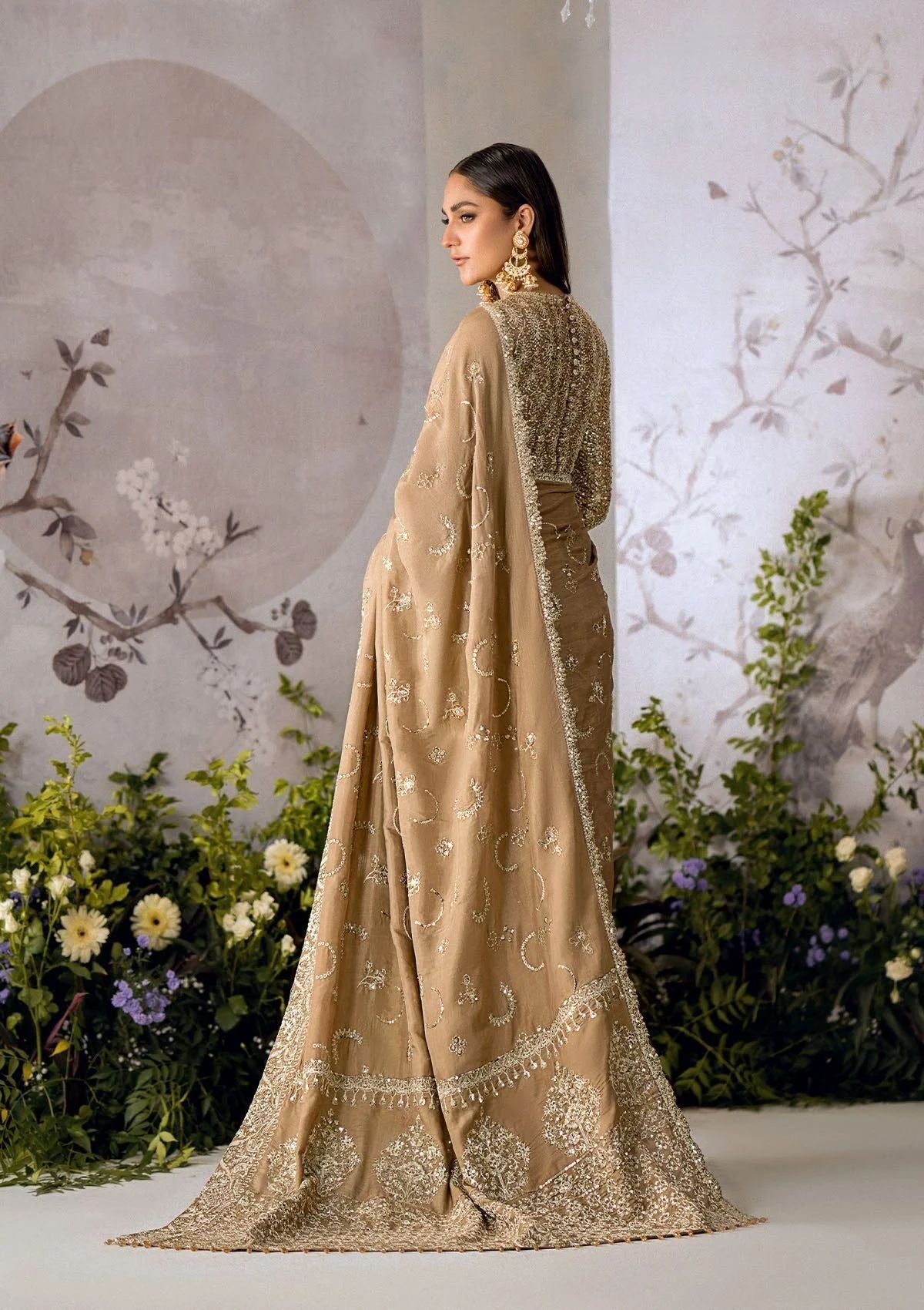 An epitome of understated sophistication, this Light Brown Sari is crafted from luxurious Silk. Delicate light brown and gold ornaments sway on the hems, adding a touch of regal finesse, and get more intricate and fine as they move up the sari fall, creating a harmonious balance. The accompanying blouse, made in Tulle, boasts gold embroidery and shimmering sequin work, adding a hint of glamour to the ensemble.