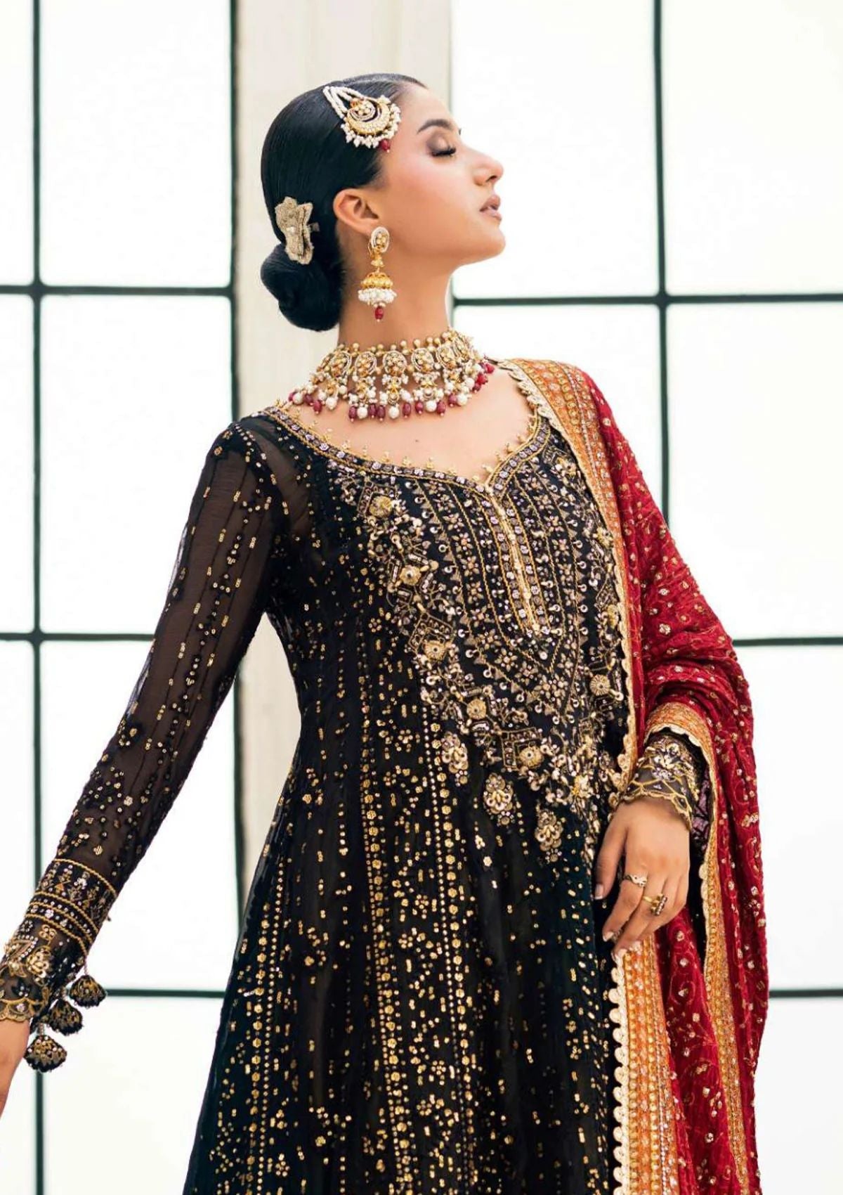 A captivating symphony of black chiffon with an orchestra of antique gold embellishments and intricate beadwork. The base is enriched with sequins shimmering against the self-hued embroidery. Along the border, neckline, and sleeves, clusters of ebony beads and gota accents add more dimension to the Look. The final culmination of this breathtaking design is the scarlet silk chaadar with bronzed hems, fashioned in a traditional kamdani style.