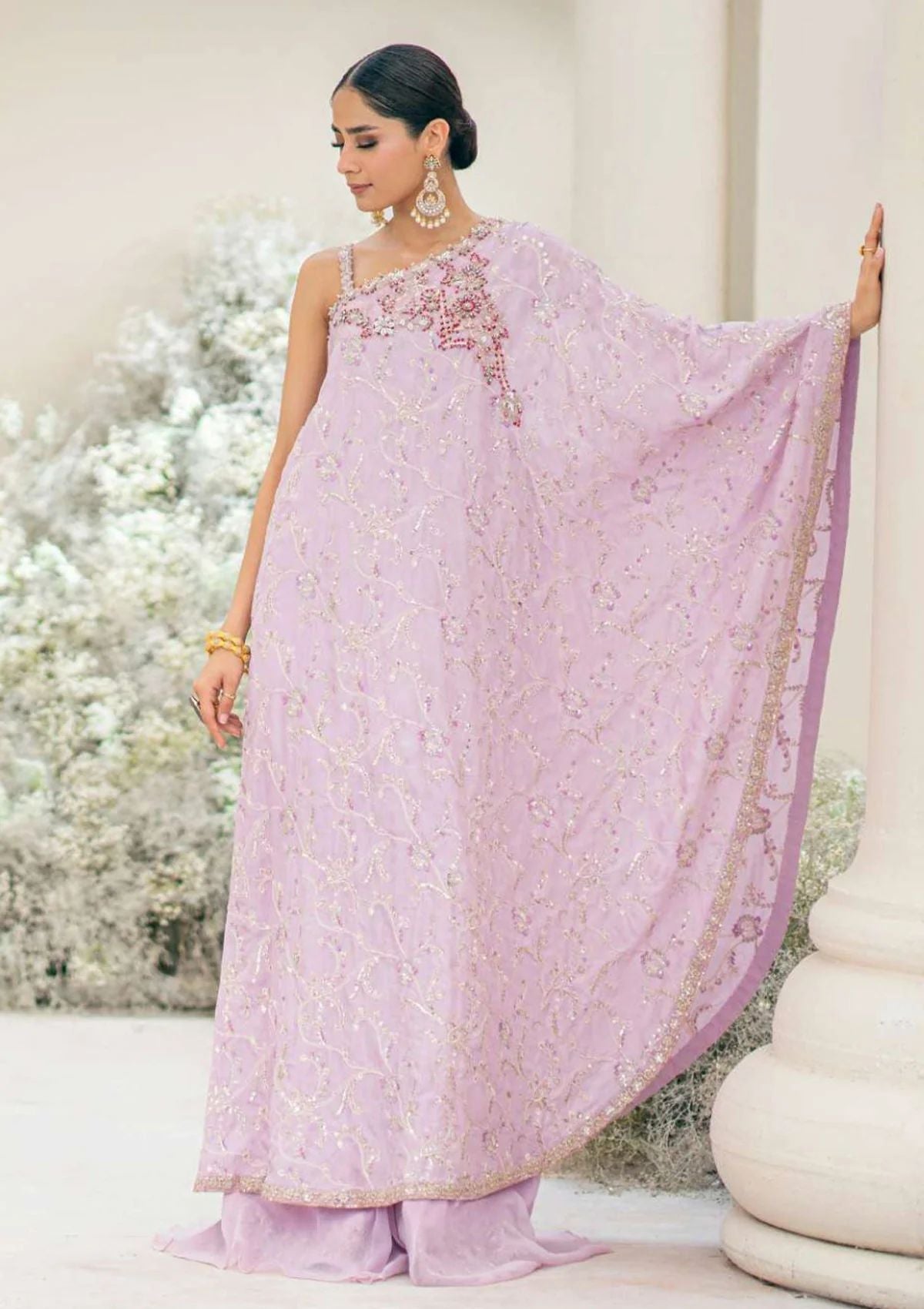 Periwinkle crystals sparkle in this delicate and feminine pastel Look imagined on a plush silk canvas. A running design of intricate embellishments and shimmering sequins graces the fabric, creating a captivating interplay of glimmer and texture. Lace-like embroideries delicately adorn the hem, adding an ethereal touch to the ensemble. Giving this subtle look the final oomph is silk masoori pants.