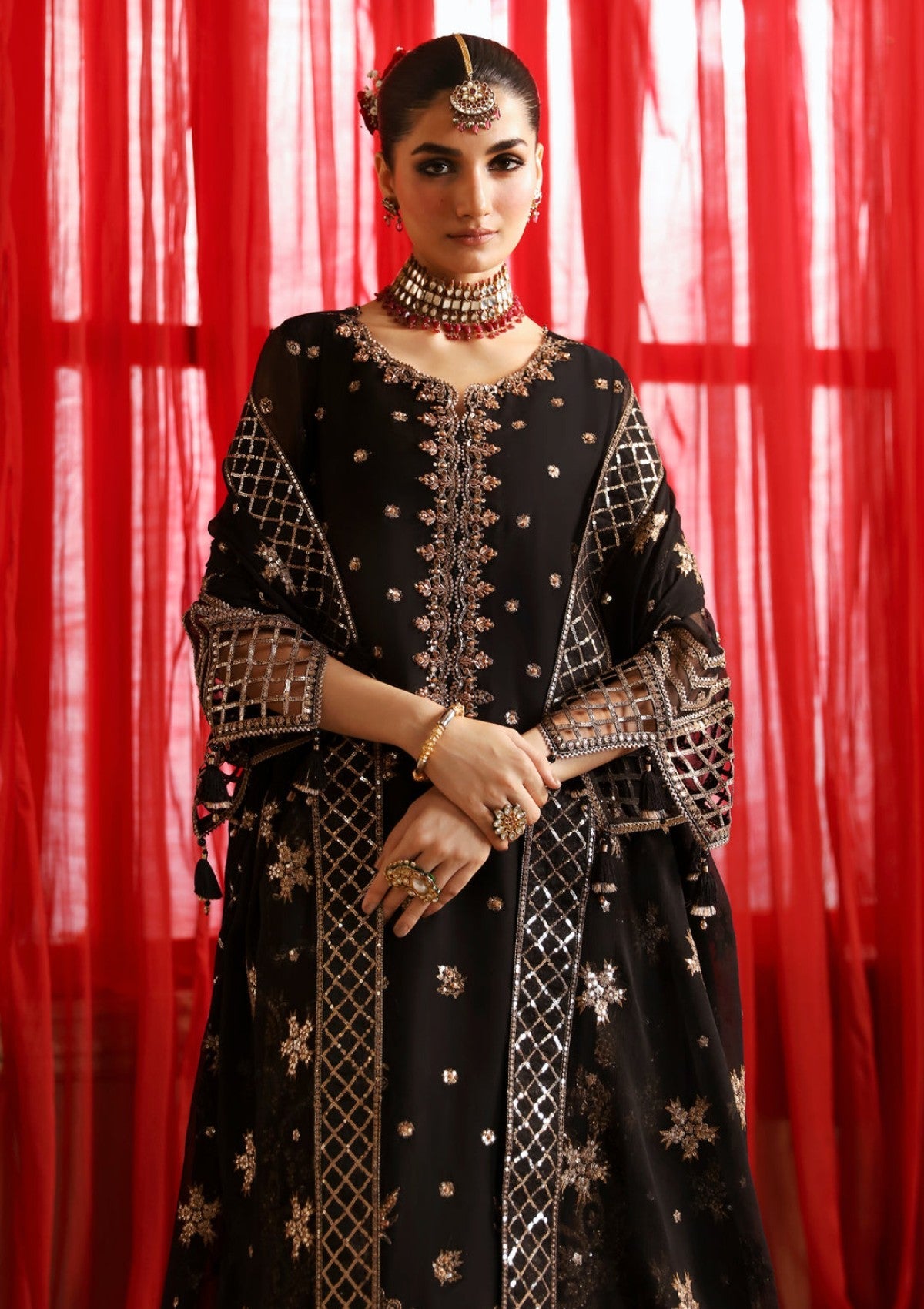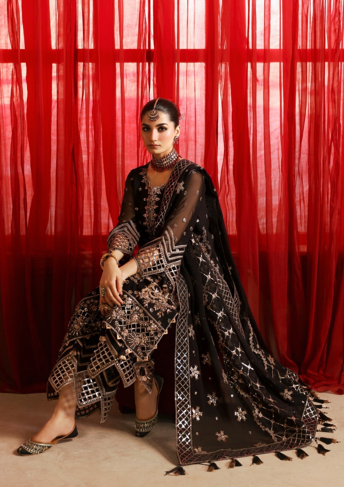 Nainais a stunning black ensemble onabreathable chiffon base.The bodice features craftsmanship, adorned with intricate hand embellishments, threadwork on the chiffon fabric's front and back, and floral motifs, creating a distinctive look.The hand-embellished sleeves add striking detail, while the embroidered chiffon dupatta, featuring geometric patterns, elevates the ensemble. Paired with tonal raw silk trousers,this ensemble is ideal for making unforgettable moments.