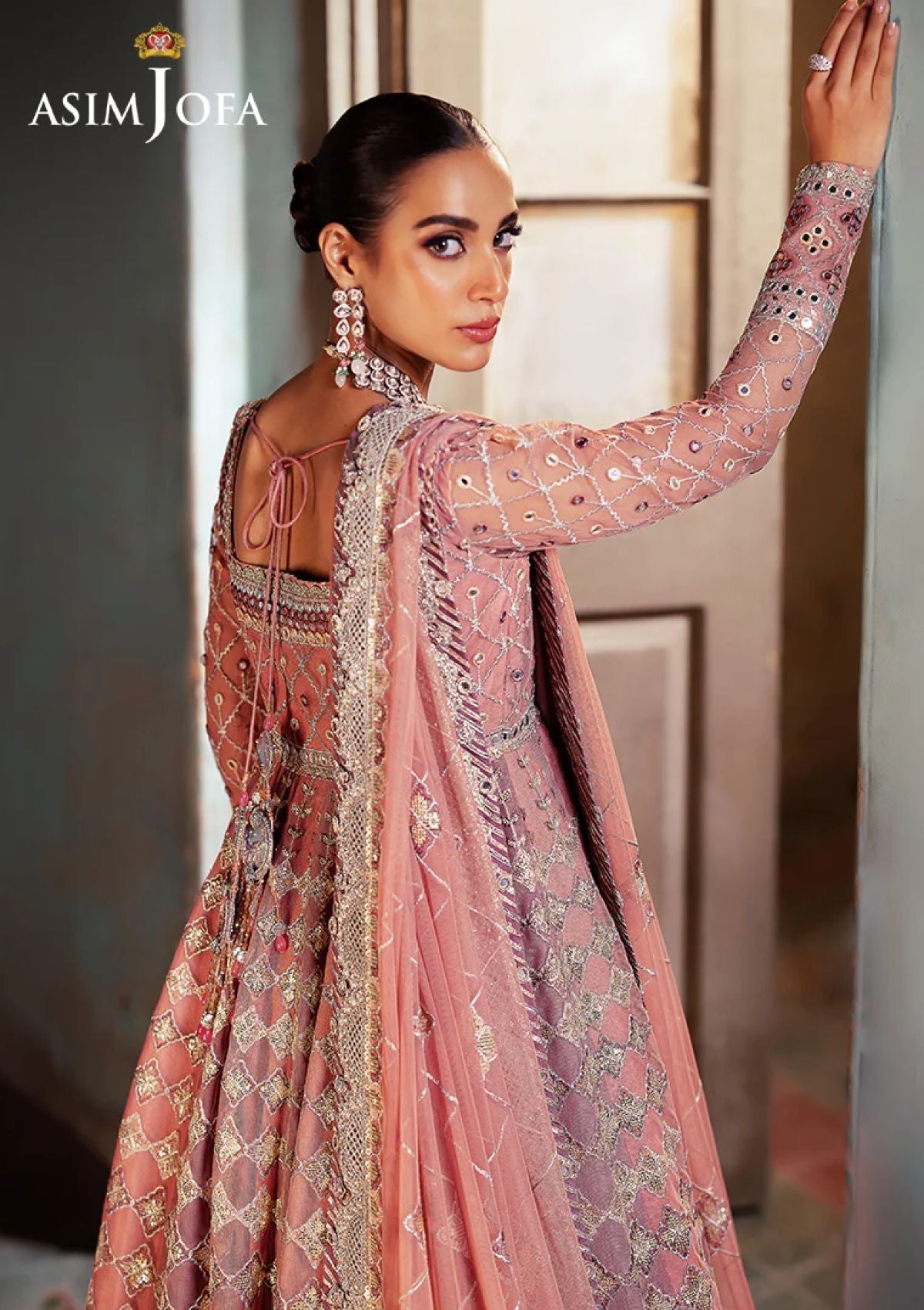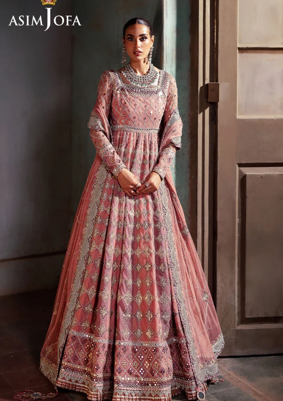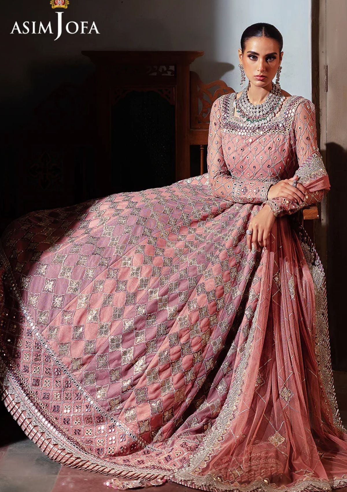 Echoing the charm of a rose garden, this ensemble redefines feminine grace. The embroidered Peshwas, a blooming work of art, is delicately adorned with light gold zari weaving through soft tea pink, lilac, and beige threads. Sparkling accents of light gold 3mm cupped sequins are artfully dispersed across the outfit, while 9mm sequins illuminate the borders and bodice, enhancing its beauty. Paired with an embroidered dupatta, a gentle breath of elegance, this ensemble is a vision of pure perfection.
