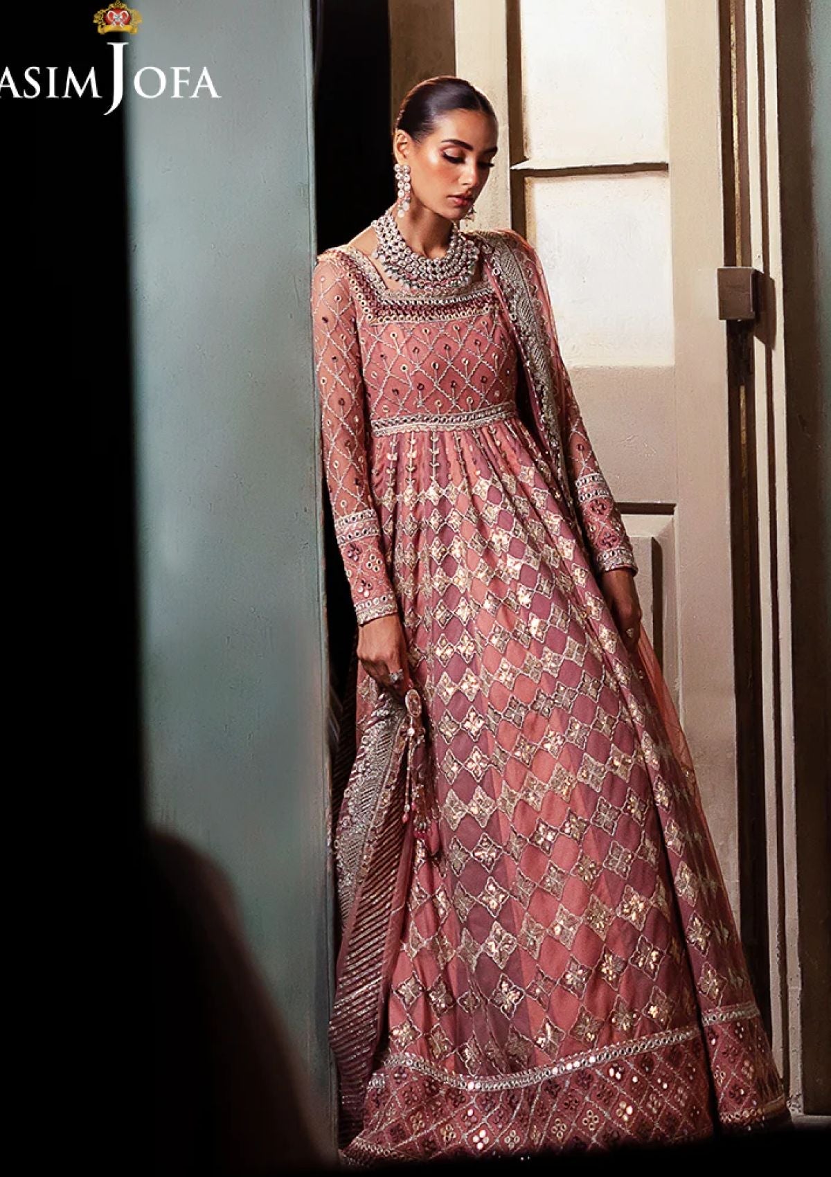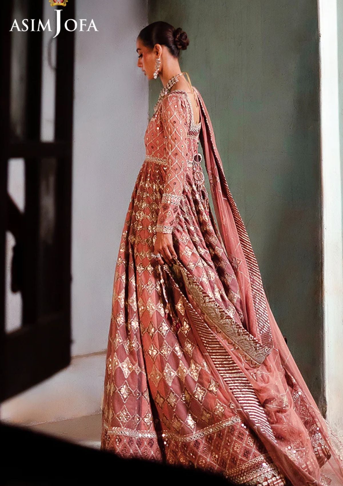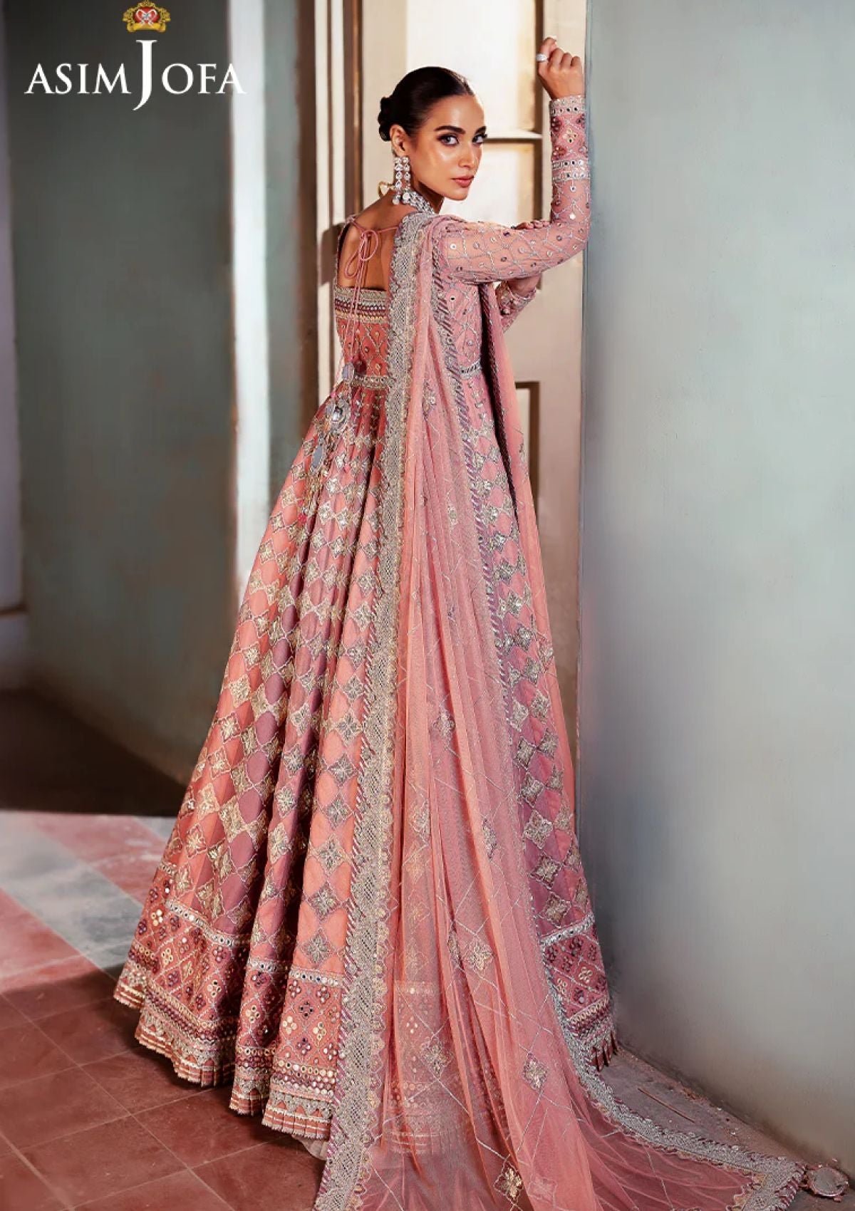 Echoing the charm of a rose garden, this ensemble redefines feminine grace. The embroidered Peshwas, a blooming work of art, is delicately adorned with light gold zari weaving through soft tea pink, lilac, and beige threads. Sparkling accents of light gold 3mm cupped sequins are artfully dispersed across the outfit, while 9mm sequins illuminate the borders and bodice, enhancing its beauty. Paired with an embroidered dupatta, a gentle breath of elegance, this ensemble is a vision of pure perfection.