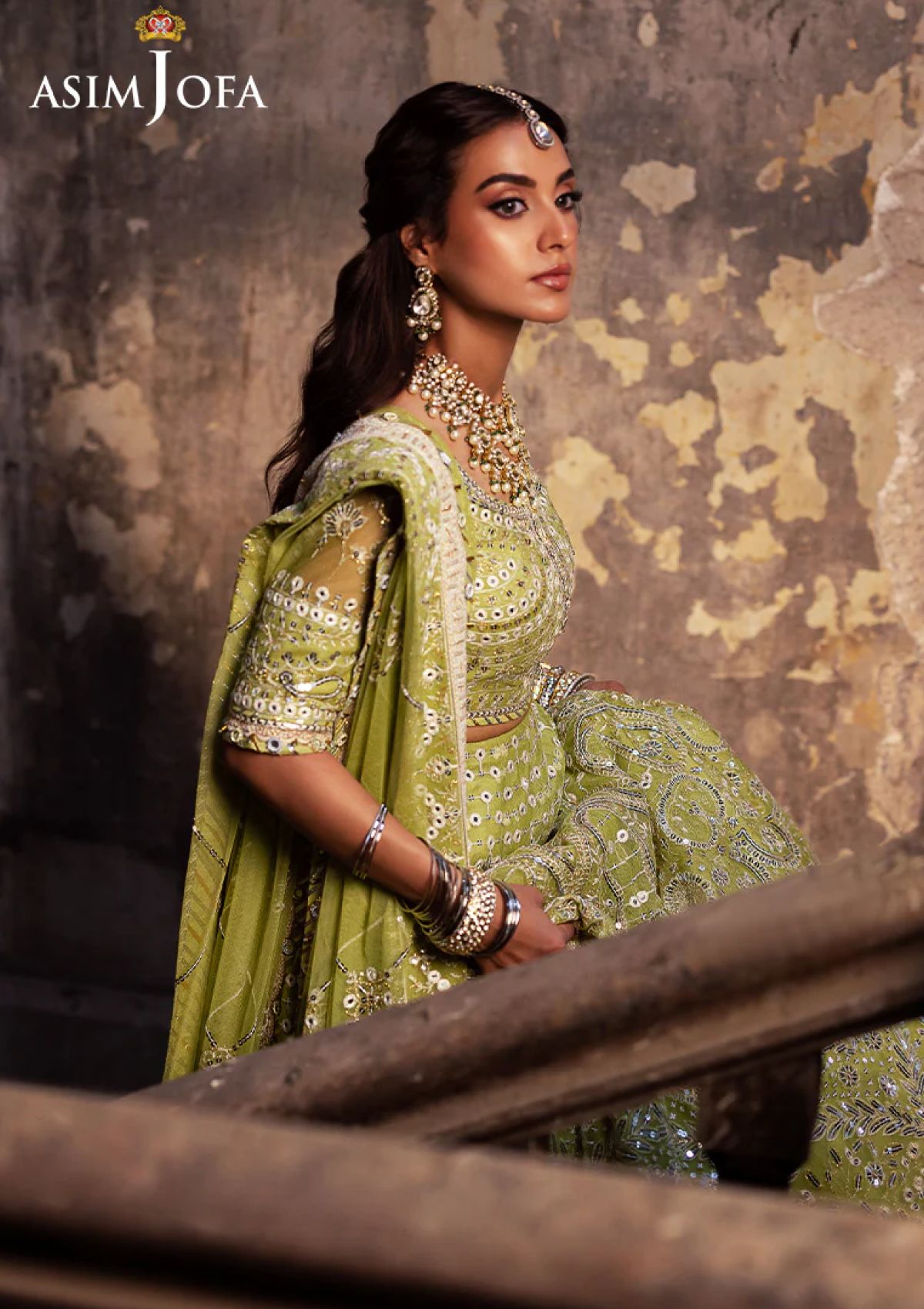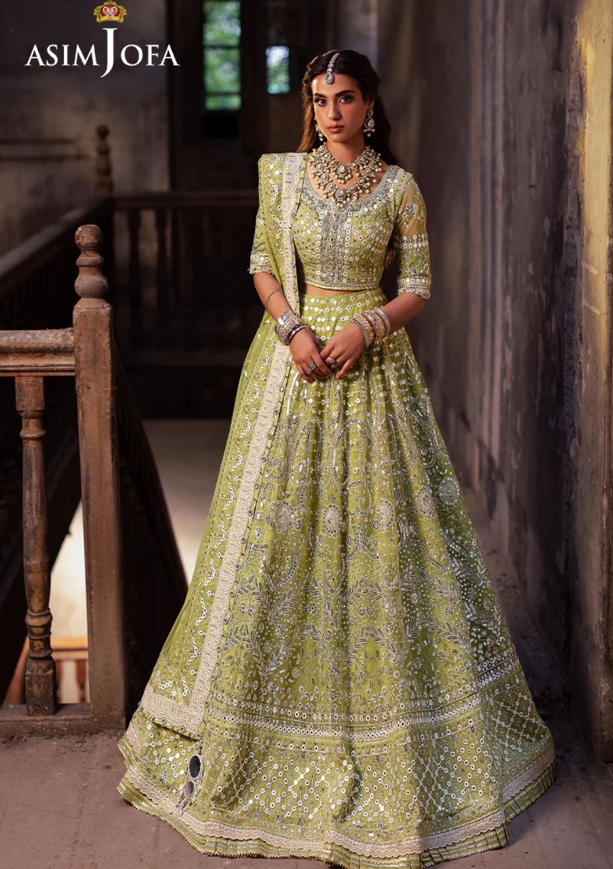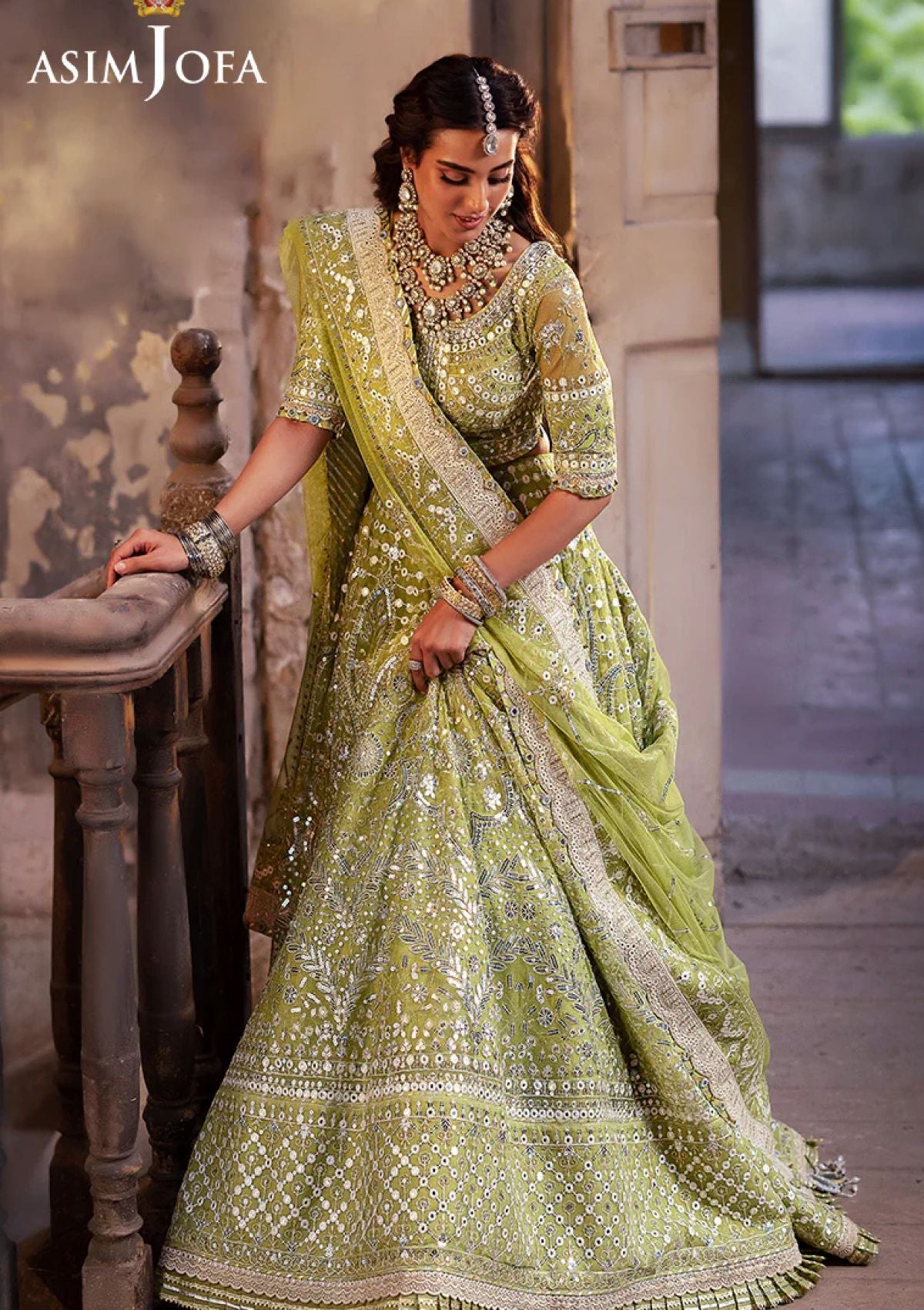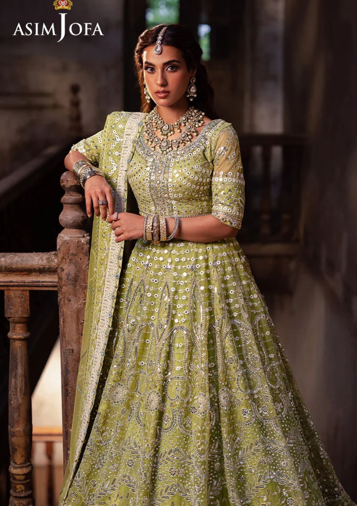 Wrapped in the soft, muted shades of green, this ensemble embodies a quiet elegance. Adorned with delicate golden lurex and beige threads, the fabric glistens with dew-like silver sequins in 9mm and 5mm sizes, capturing a gentle shimmer. The embroidered dupatta, a sheer veil of beauty, crowns this nature-inspired creation, promising a look that captivates with understated grace and leaves an unforgettable impression.