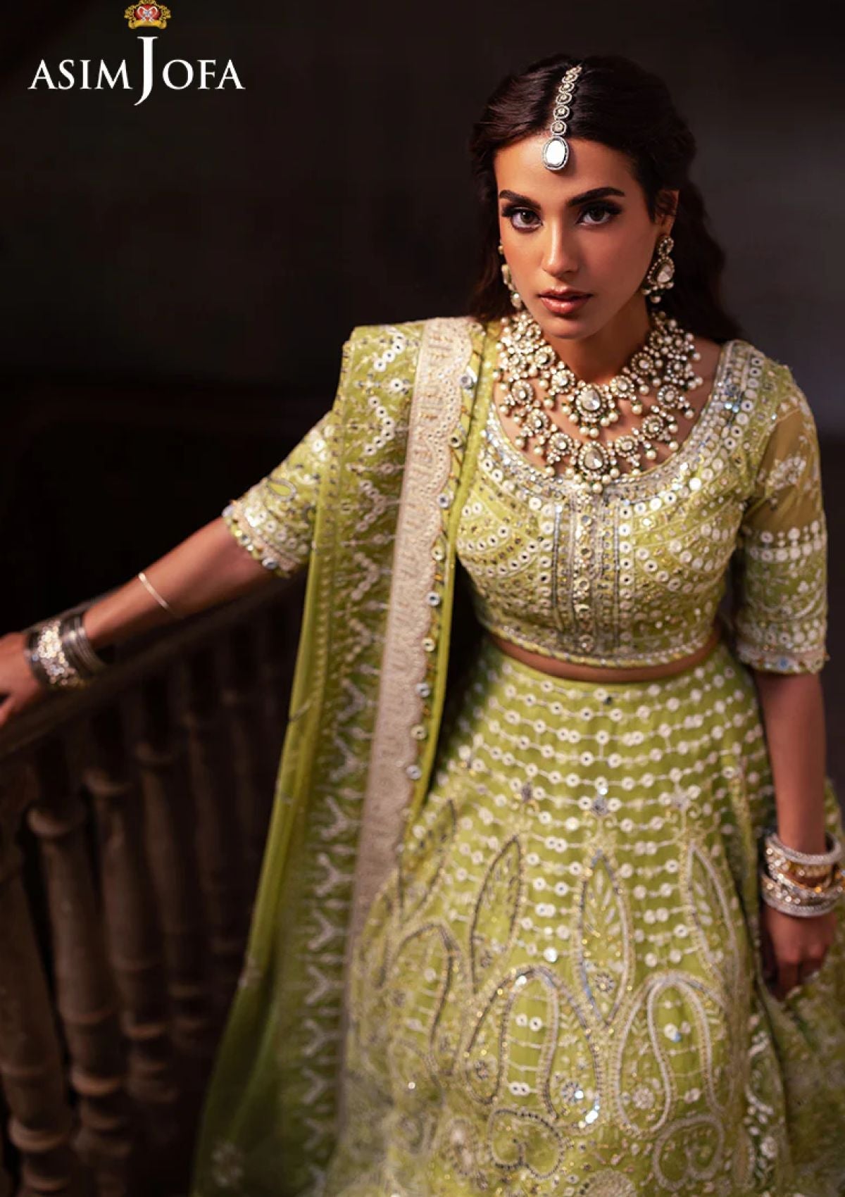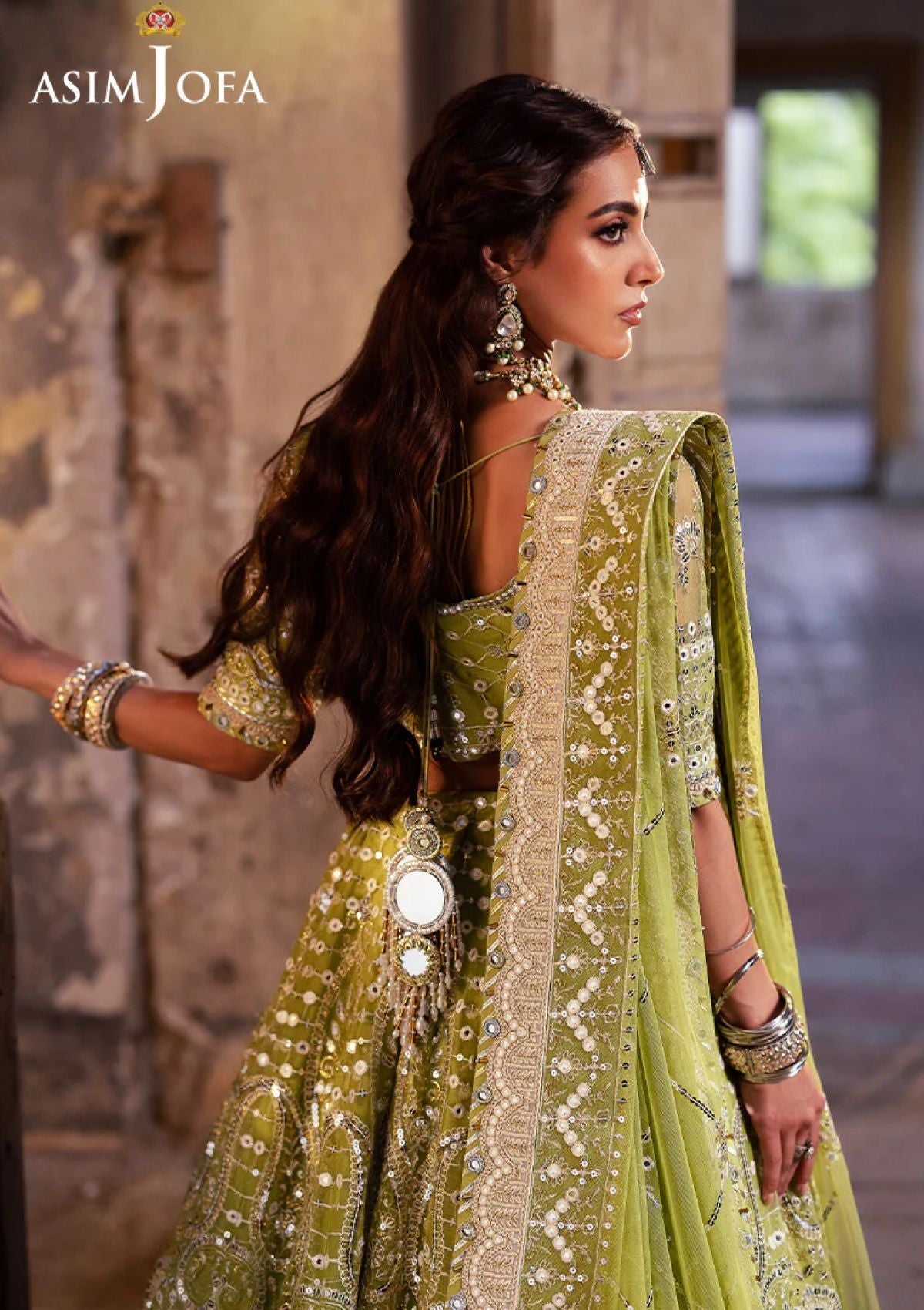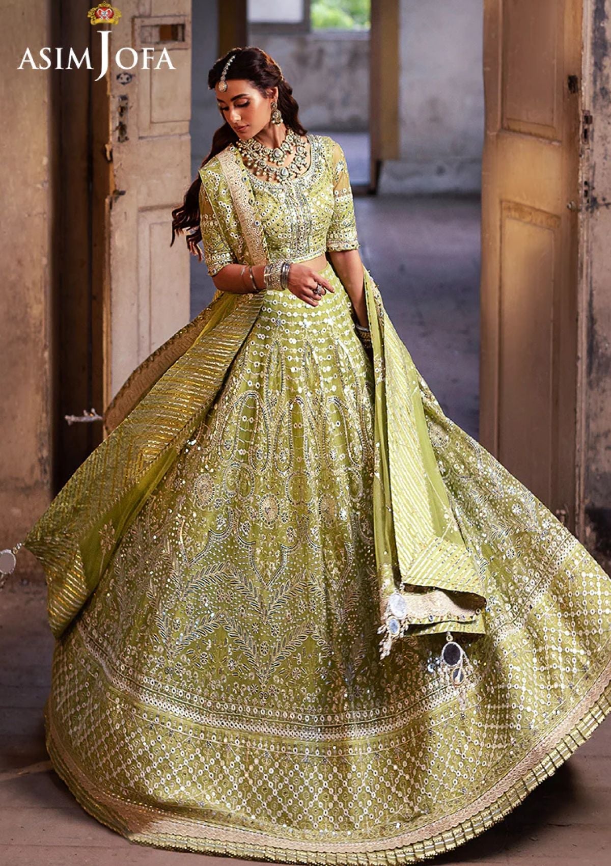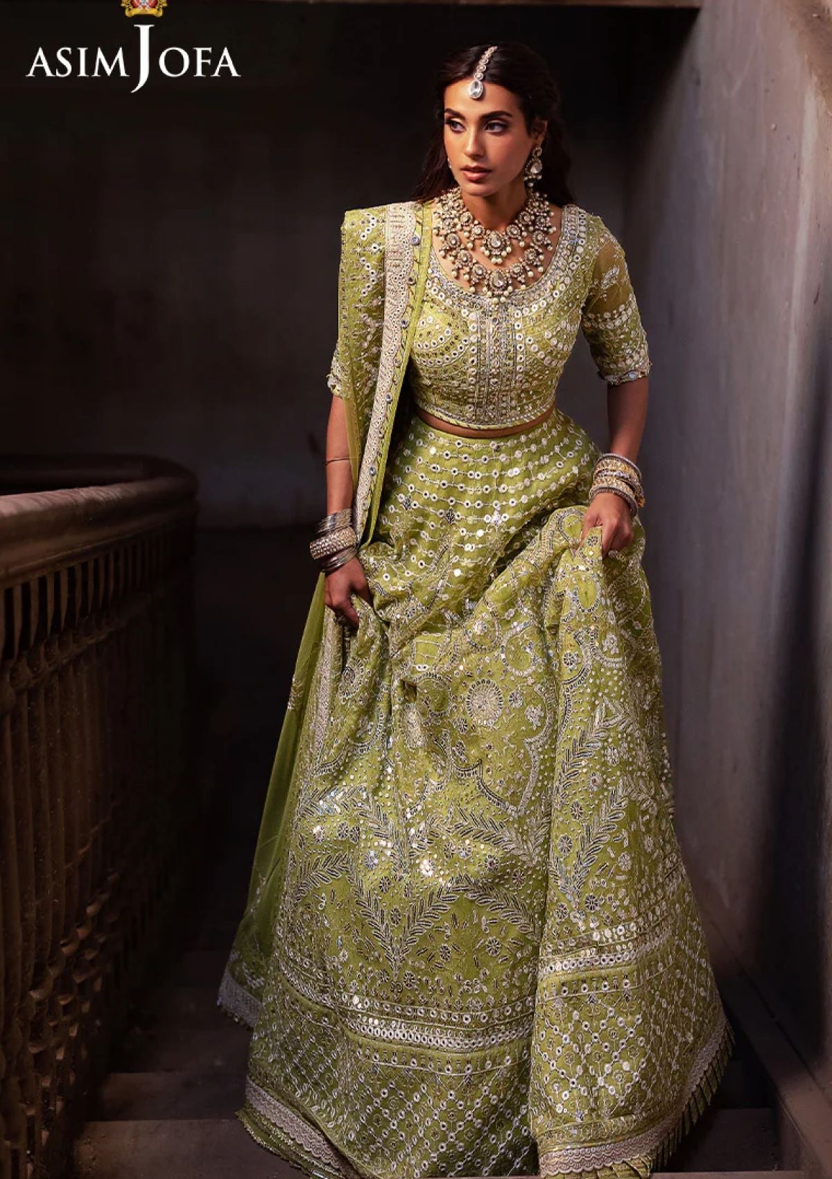 Wrapped in the soft, muted shades of green, this ensemble embodies a quiet elegance. Adorned with delicate golden lurex and beige threads, the fabric glistens with dew-like silver sequins in 9mm and 5mm sizes, capturing a gentle shimmer. The embroidered dupatta, a sheer veil of beauty, crowns this nature-inspired creation, promising a look that captivates with understated grace and leaves an unforgettable impression.