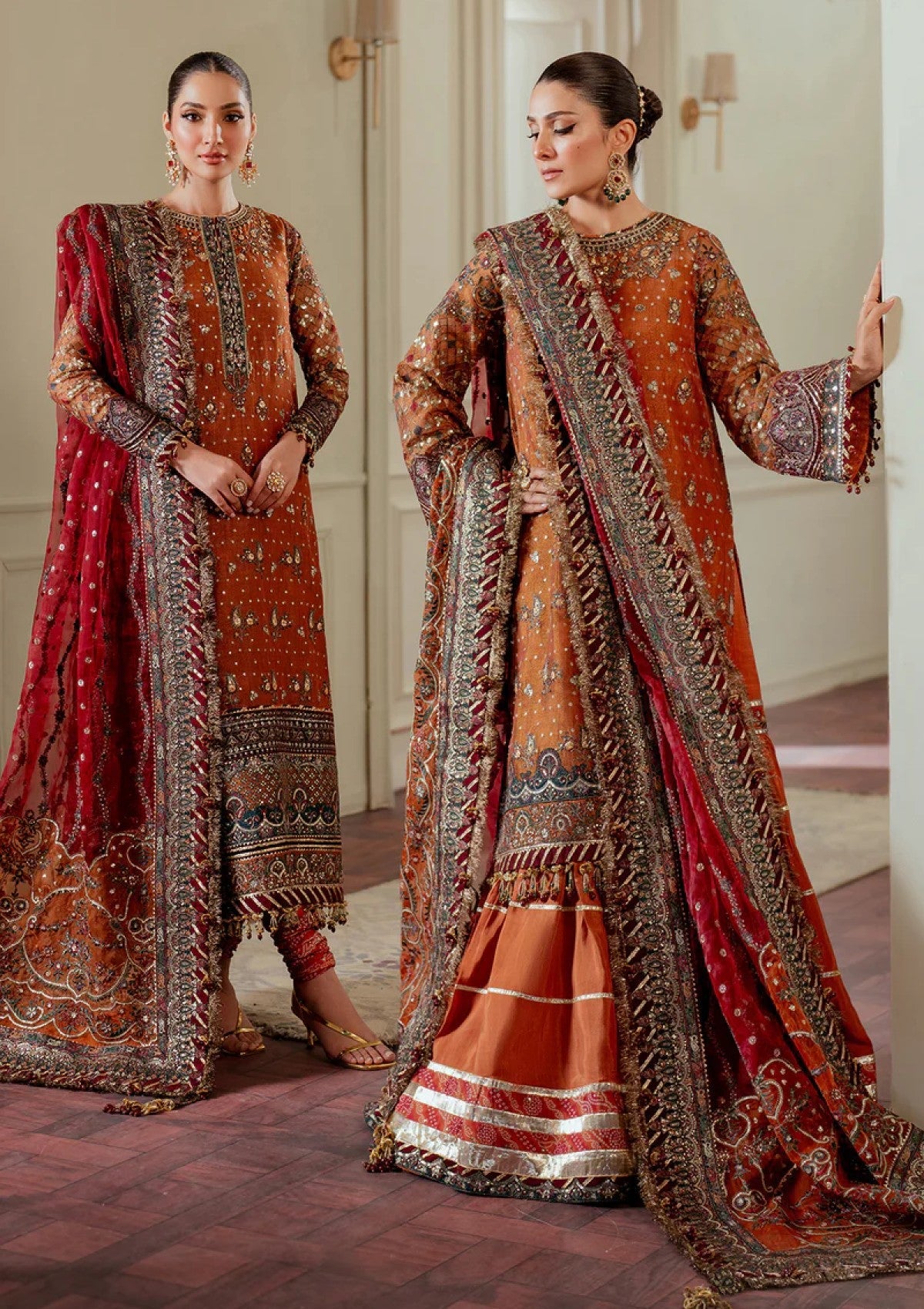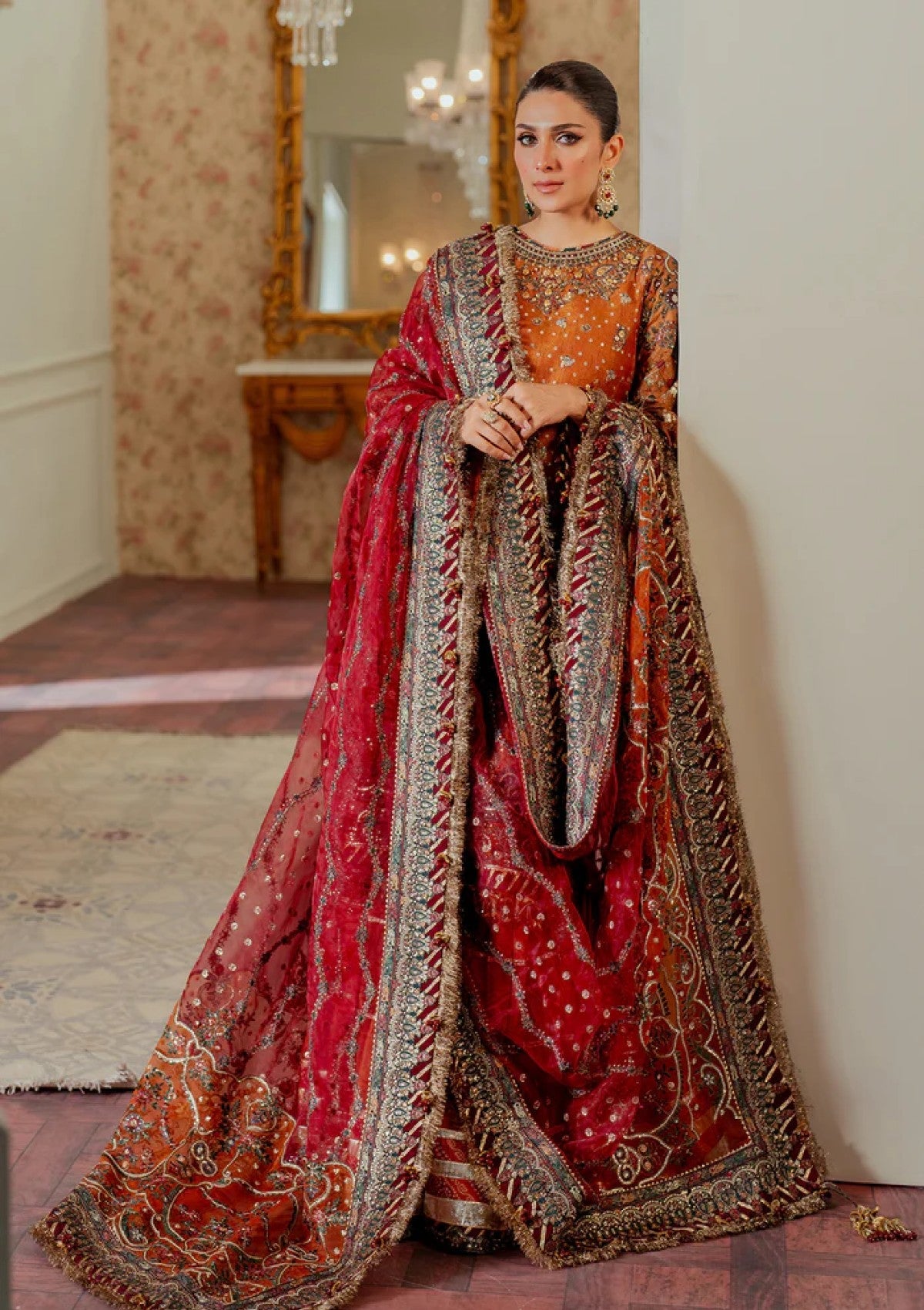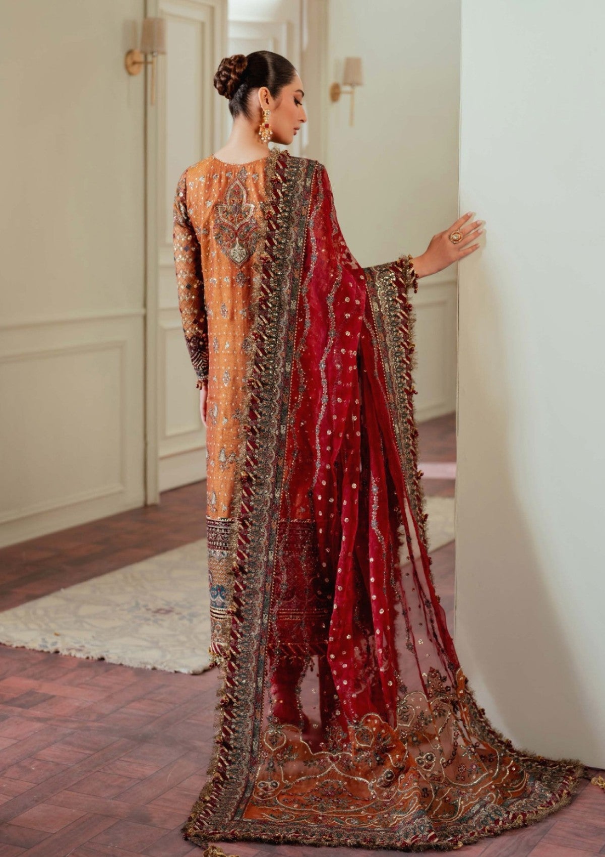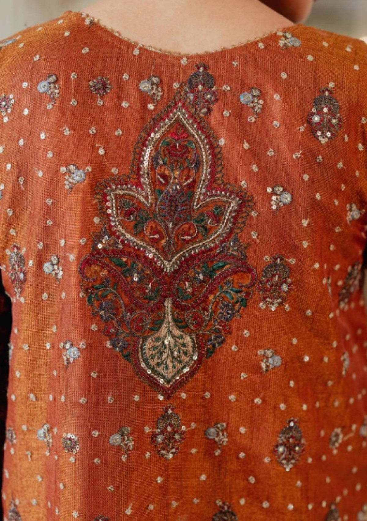 An elegantly draped dupatta with four-sided grip borders and an organza border along each pallu. It features a delicategolden sequinpattern with embroidered tilla and thread detailing that complements the overall ensemble.