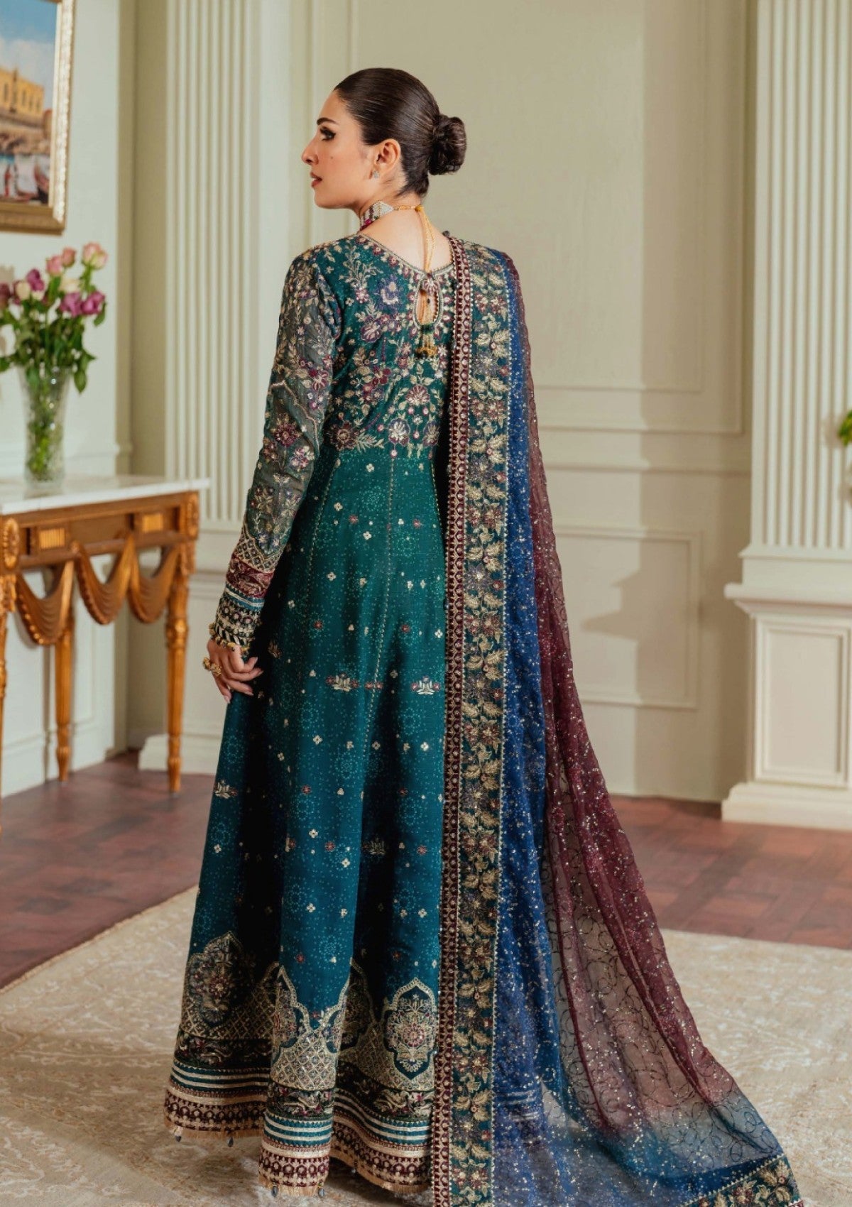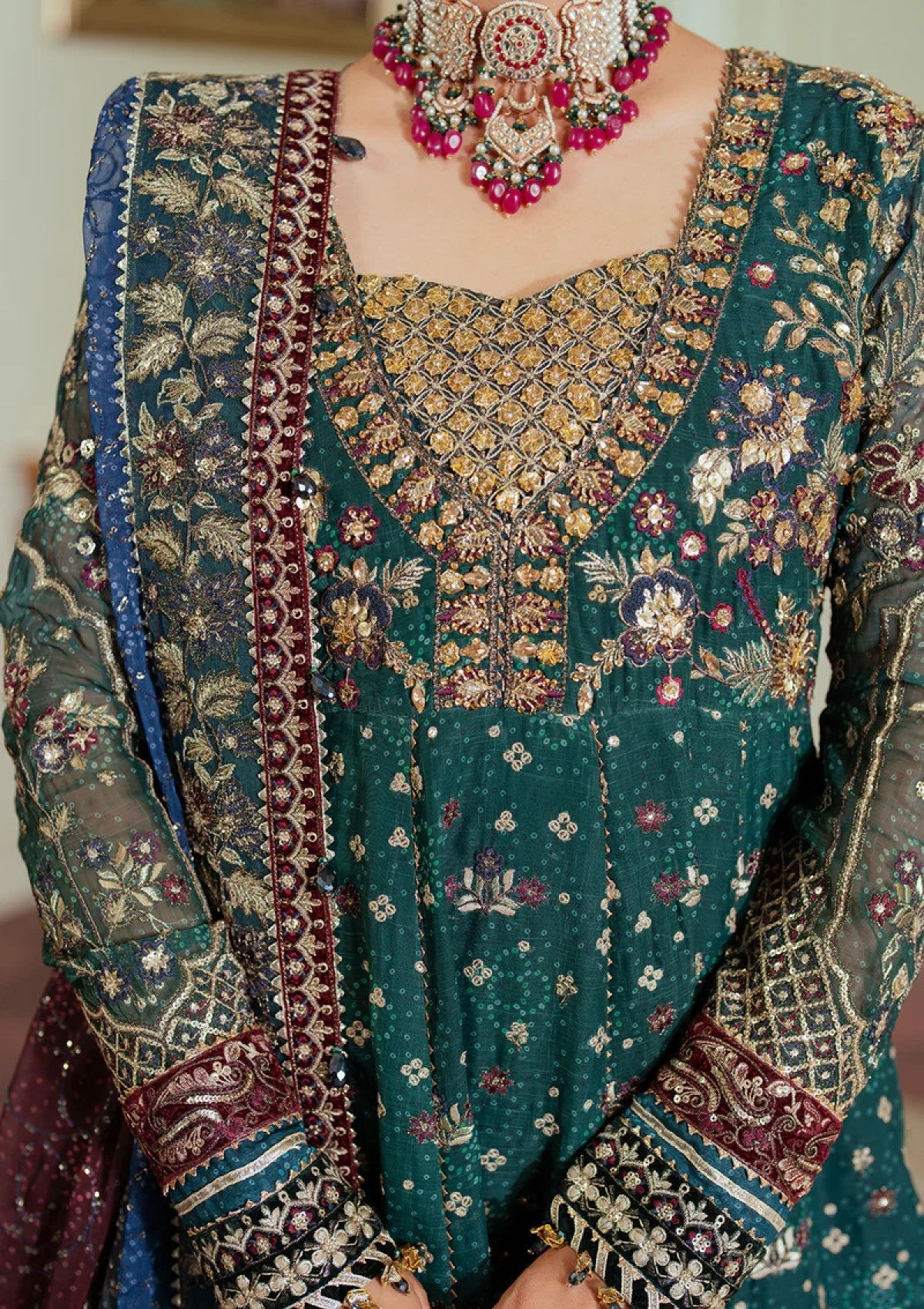 Aprintedchiffon dupatta adorned with sequins and threadwork include embroidered organza andvelvet borderto match the aesthetic of the ensemble, enhancing its luxury.