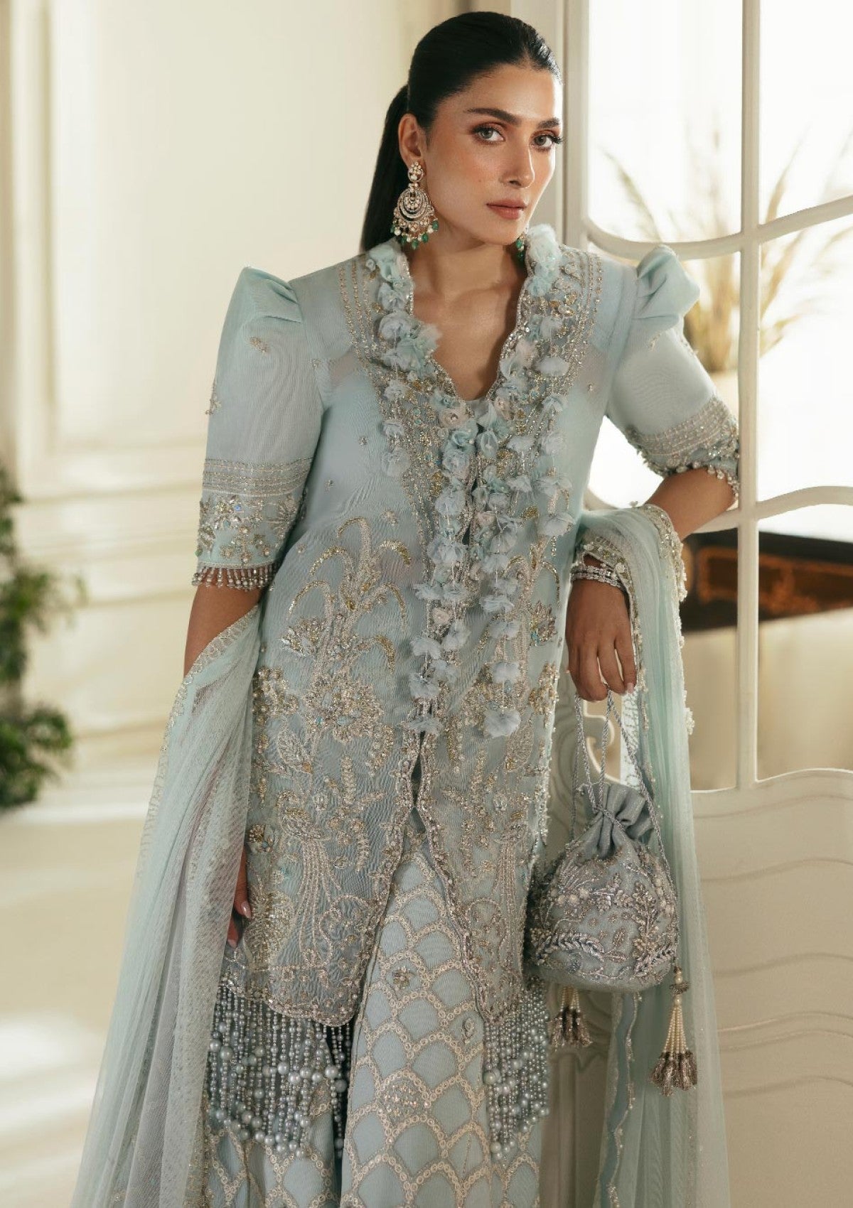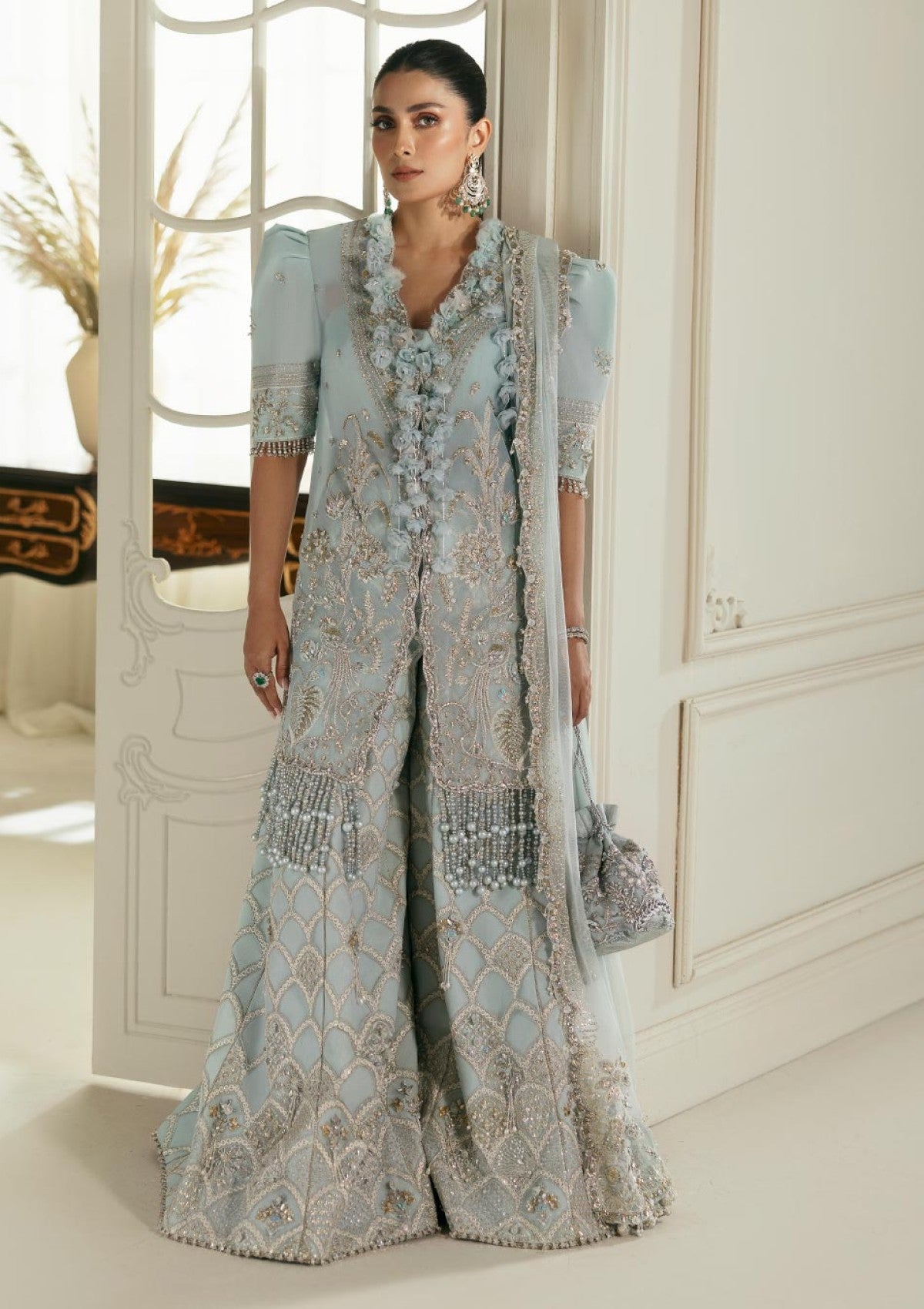 Unveiling 'Ciel de RÃÂêve' (Sky of Dreams) from ÃÂÃÂlan's wedding festive collection. Soft blue hues whisper serenity, as intricate embroidery unfurls dramatic foliage and motifs. Silver tinsel and sequins shimmer, hand-embellished with luminous silver pearls, Swarovski crystals, delicate beads and metal wire details.