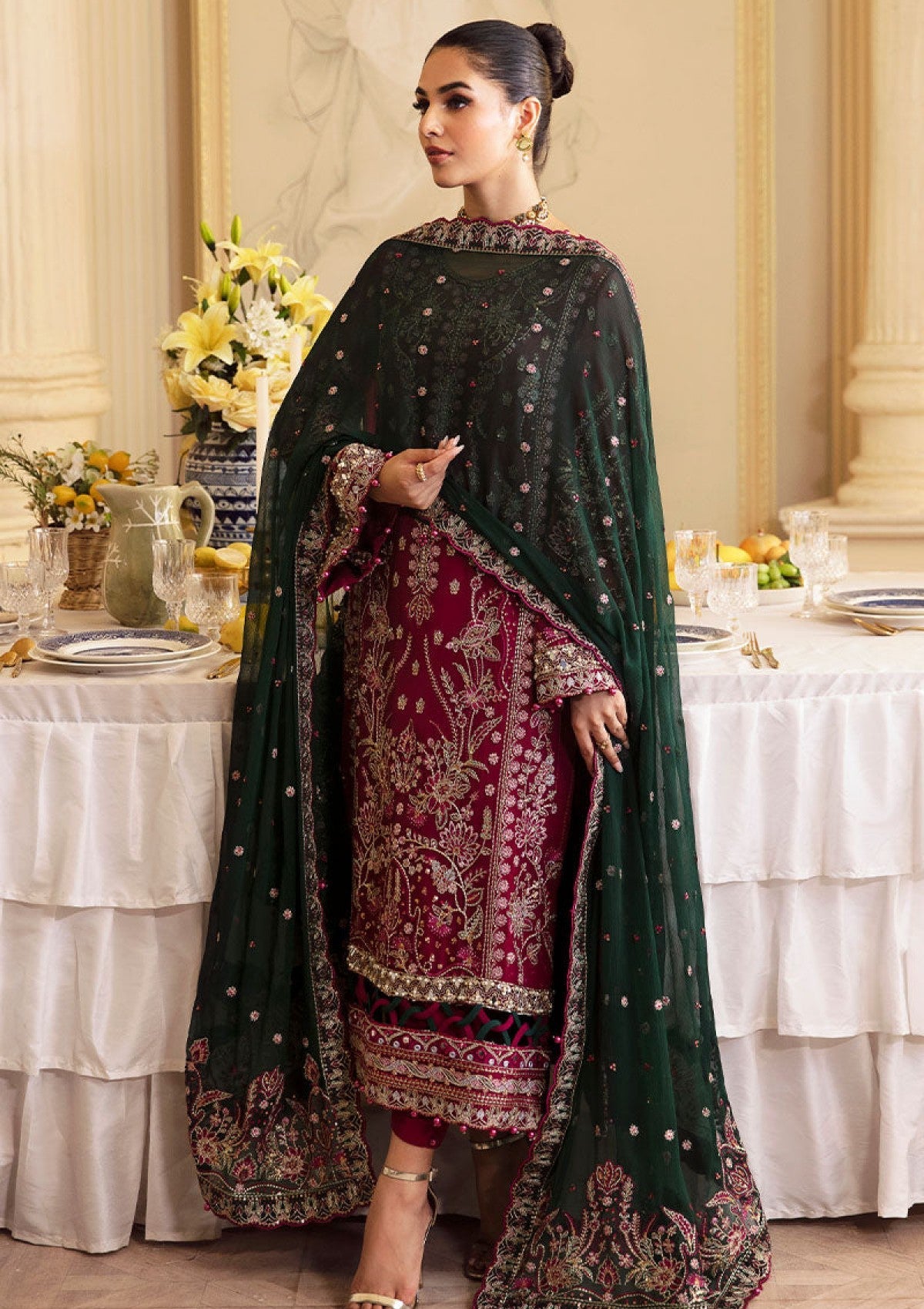 - Add-worked, embroidered & sequined organza border for sleeves
