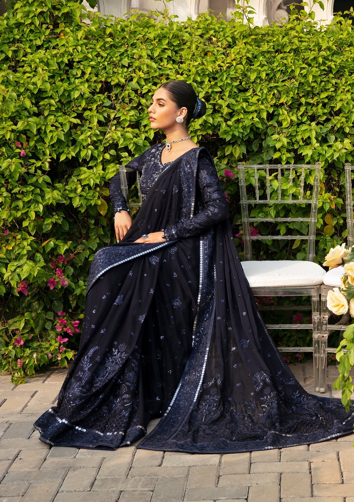 - Embroidered & sequined chiffon for saree fall