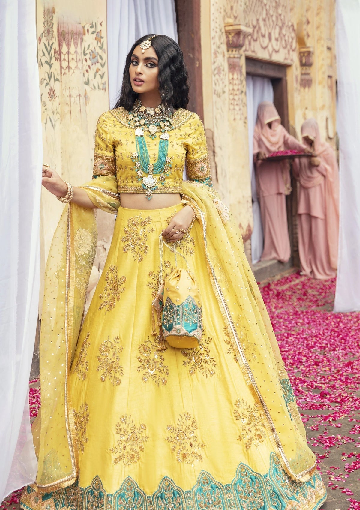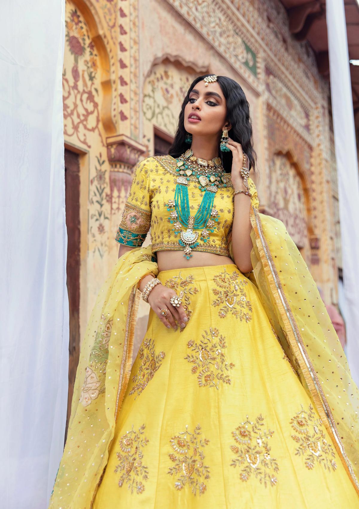 A dazzling ceremonial attire epitomizing beauty and majesty the striking canary yellow complemented by intricate gold embroidery and tila detailing exudes pure euphoria and joy.