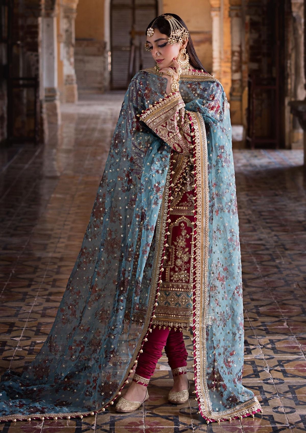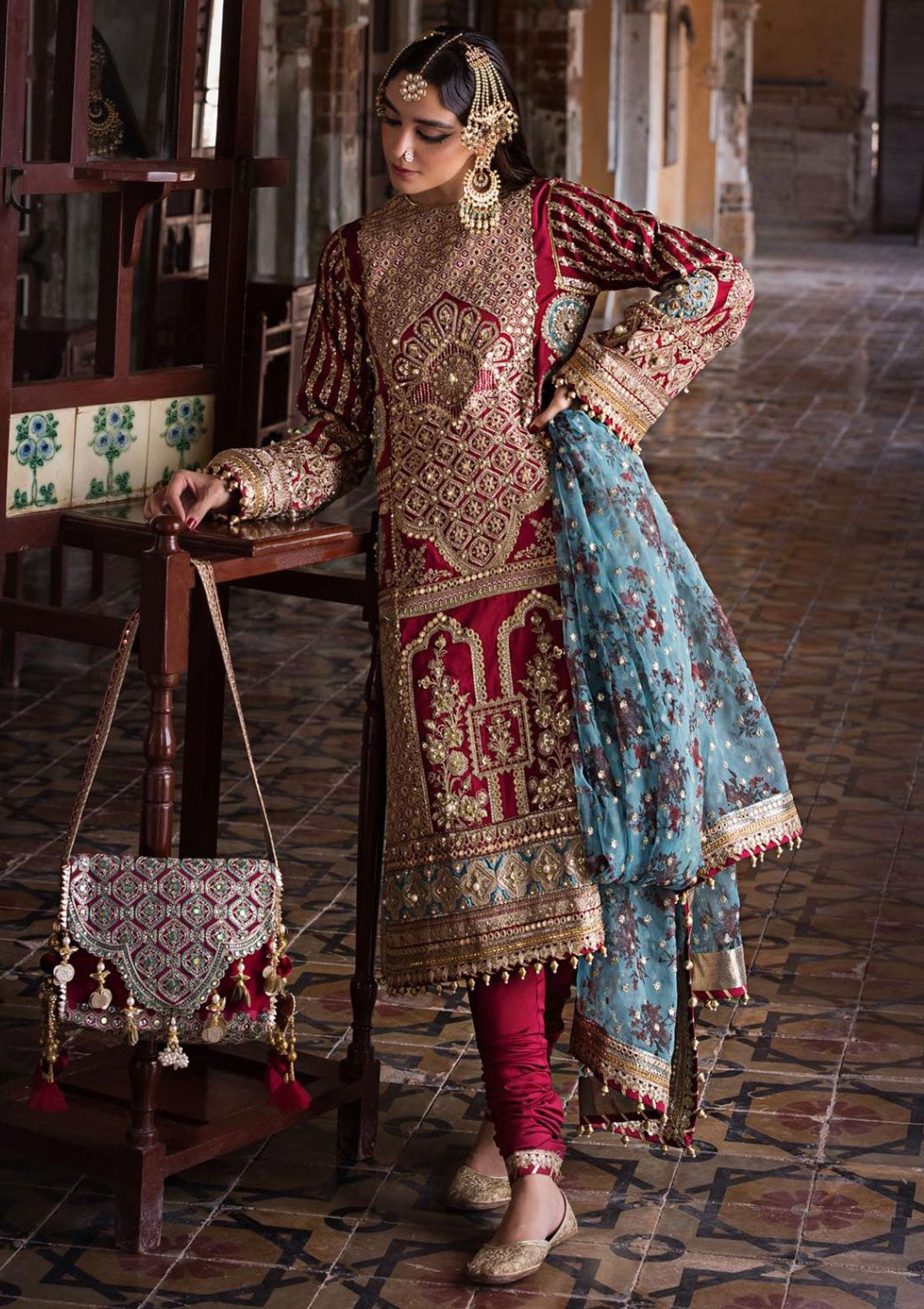 Plum Color.Introducing the 'Bibi Lal' ensemble, a breathtaking masterpiece that combines the regality of a red silk shirt with the serenity of a turquoise blue organza dupatta. The silk shirt is a canvas of intricate craftsmanship, adorned with card mirror, pearls, Tilla work, precious jewels, and ada-work. The satin silk contrast border and side circles patches lend a touch of opulence to the ensemble.Completing this enchanting composition is an organza printed and embroidered dupatta with a four-sided satin silk border, adding a harmonious contrast to the vibrant red. The silk embroidered trouser enhances the allure of 'Bibi Lal' with its rich detailing. This ensemble is a true embodiment of bridal elegance, where tradition meets contemporary splendor