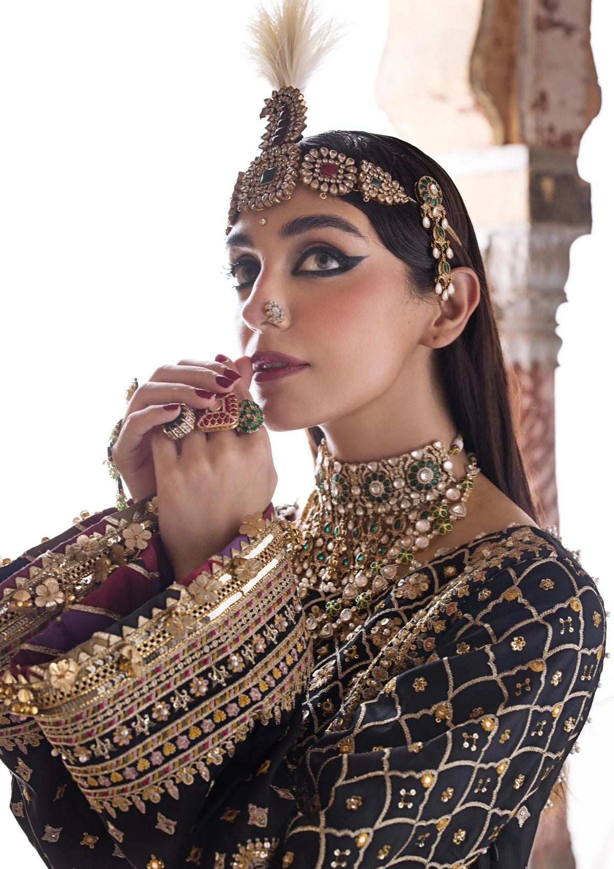 Step into the world of 'Koyal,' an ensemble as captivating as a melodious bird's song, in a stunning kohl-hued color. The silk embroidered shirt is a masterpiece of craftsmanship, featuring hand-embellished ada-work, delicate sequin work, and enchanting card mirror work, elegantly contrasted by satin silk borders.The ensemble is beautifully completed with a silk gharara boasting a floral print and a satin silk embroidered border, adding a touch of whimsical elegance. The printed and embroidered dupatta, with its four-sided satin embroidered border, is the final note in this symphony of style. 'Koyal' is a celebration of grace and artistry, the perfect choice for brides who seek timeless beauty with a touch of the extraordinary.