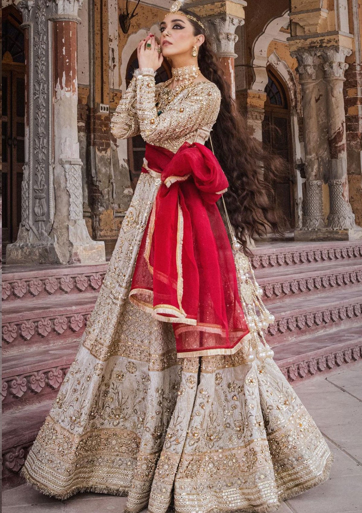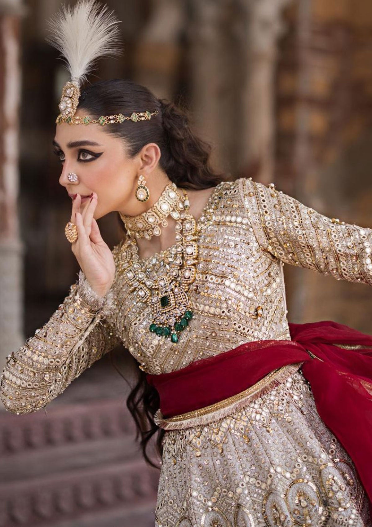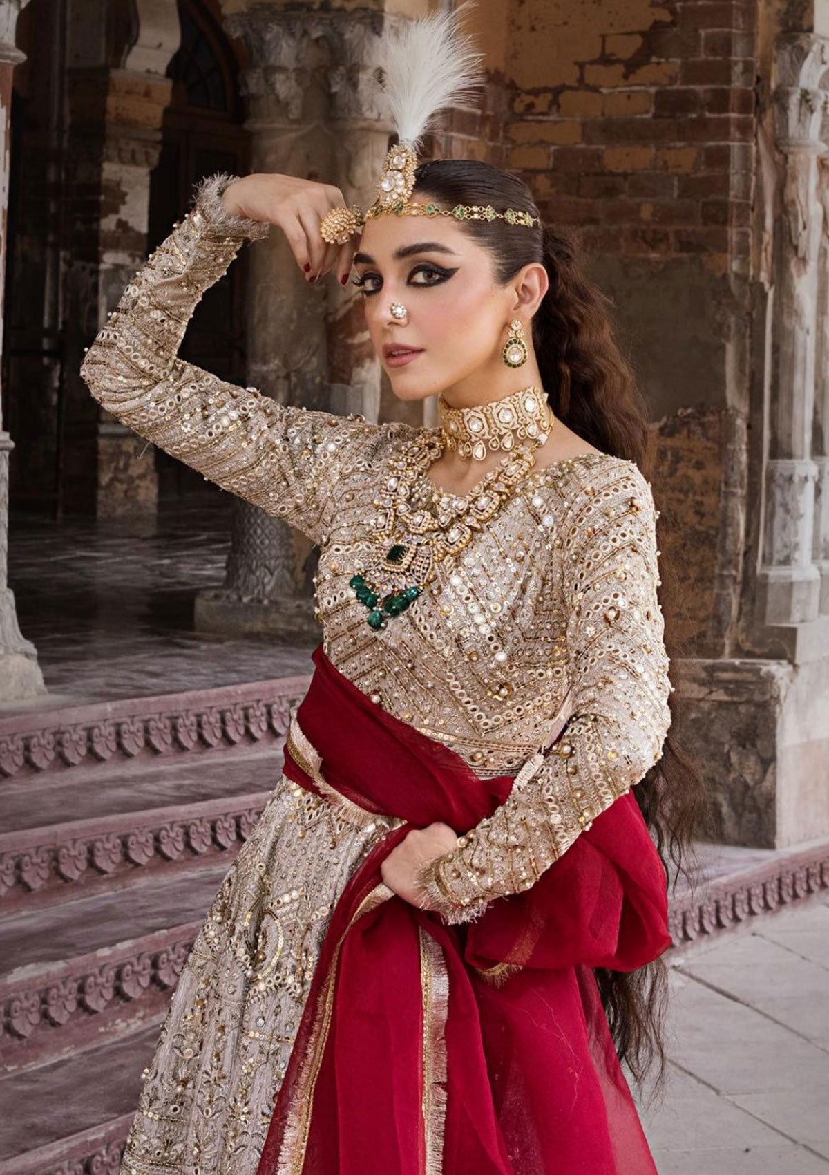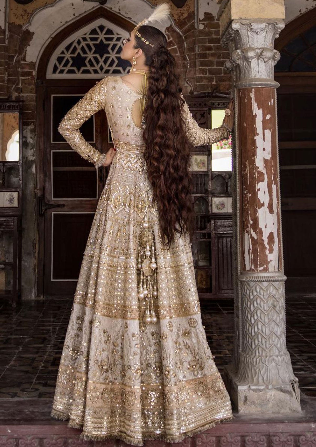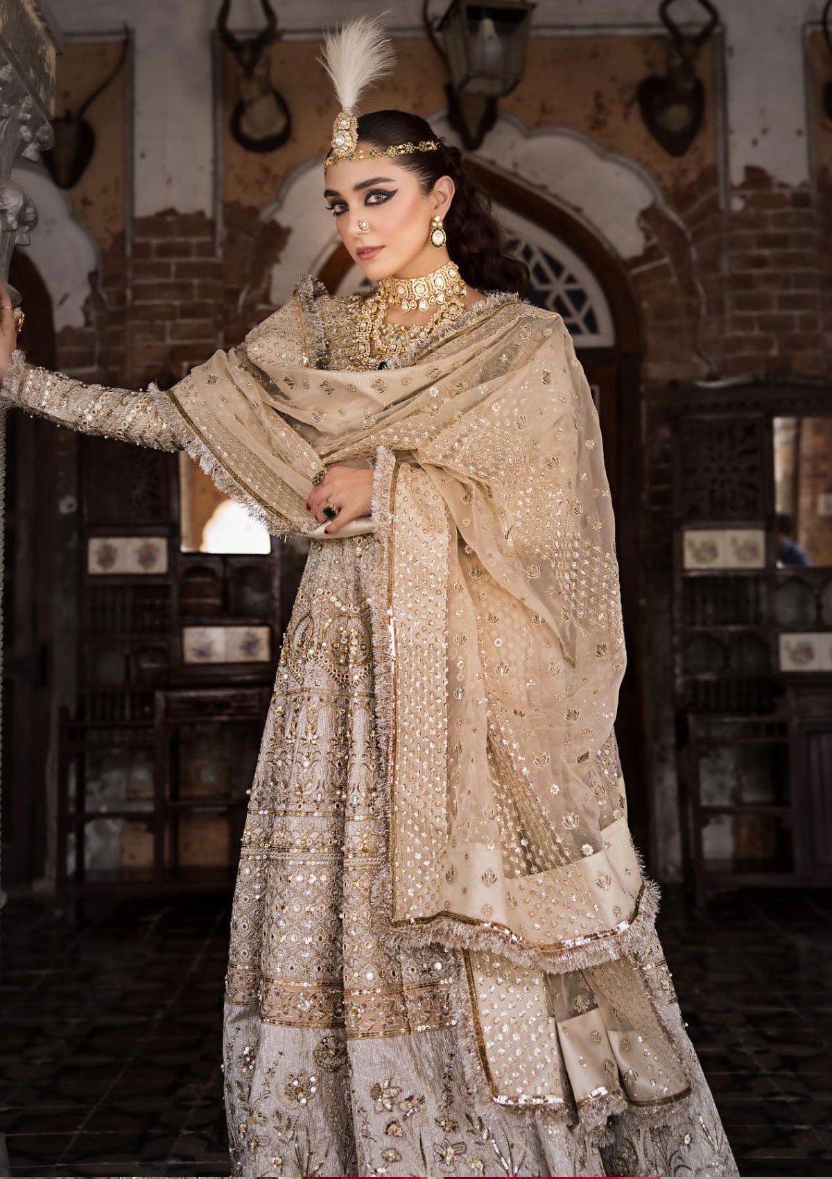 The 'Moti' ensemble, in a delicate palette of sea shell, desert sand, and cream tones, is an exquisite symphony of craftsmanship. Its embroidered shamar tilla net, boasting 16 hand-embellished panels adorned with pearls, stones, and a profusion of gold and silver twin sequins, is a work of art. Two distinct embroidered and embellished patches on satin silk add a unique charm, and the complete hem border on net lends an ethereal touch.The ivory organza dupatta features sequin and motif embroidery, perfectly complementing the allover embroidery and embellishments on the bodice and sleeves. With the satin silk belt adding a finishing touch, 'Moti' is a testament to timeless beauty and the artistry of bridal elegance
