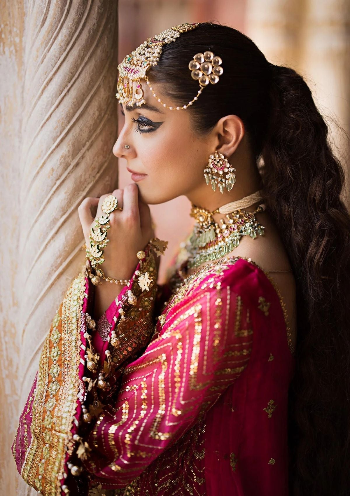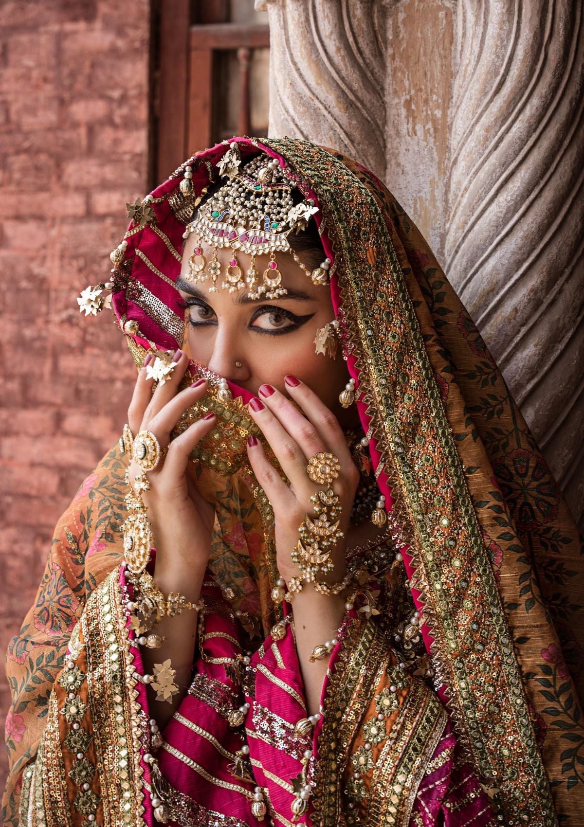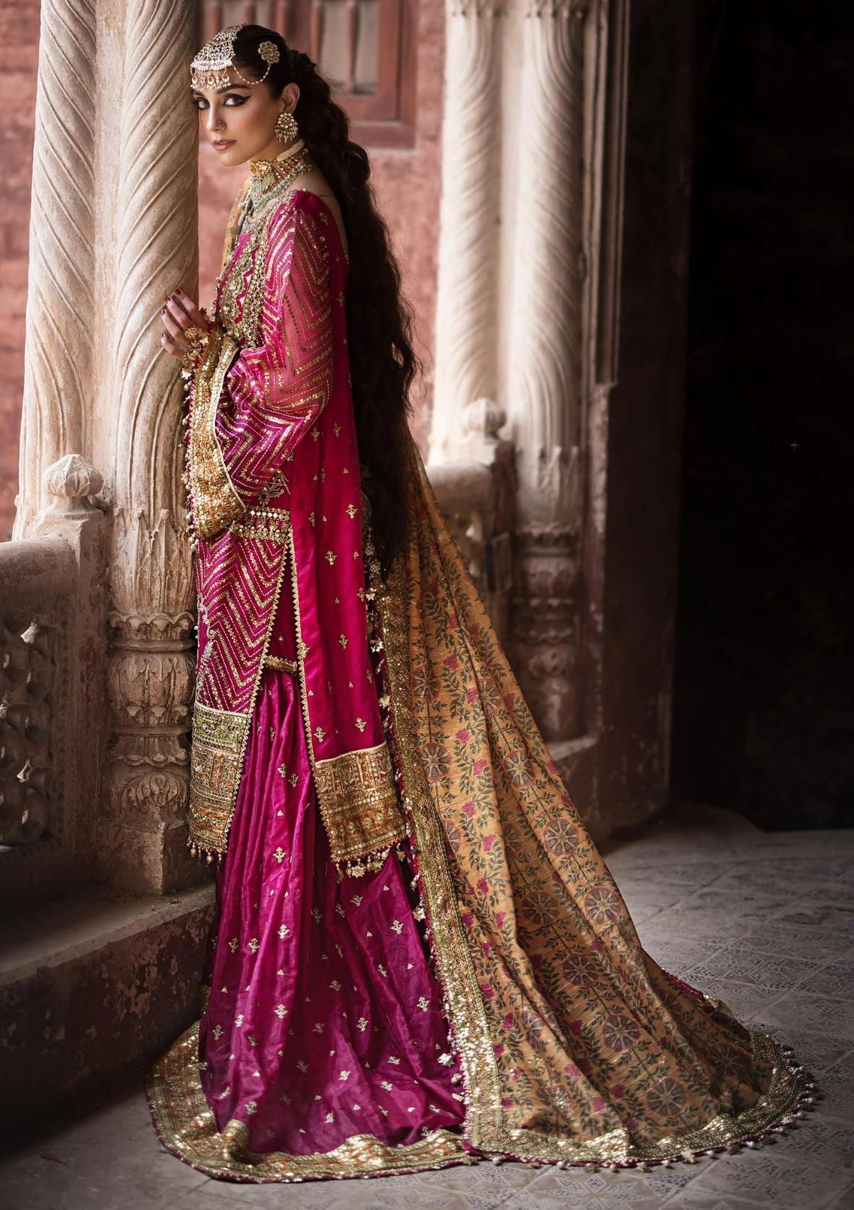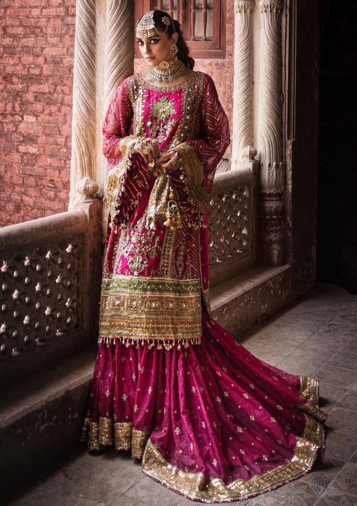 Step into the lush and vibrant world of 'Naranji Bagh,' where the ensemble's rani pink and red hues are a testament to its opulent charm. The embroidered organza shirt is a masterpiece, adorned with exquisite hand-embellished pearls, sequin and mirror work, and allover sequin detailing on the sleeves. Two different satin silk borders in parrot green and mustard add a unique and lively contrast.The embroidered gharara, enriched with intricate details and embroidered satin silk border, adds a touch of sophistication to this ensemble. The printed dupatta on cotton slub, adorned with sequin and embroidered four-side satin silk border, completes the picture of timeless elegance. 'Naranji Bagh' is a celebration of color and craftsmanship, ideal for brides who seek an extraordinary and unforgettable look.