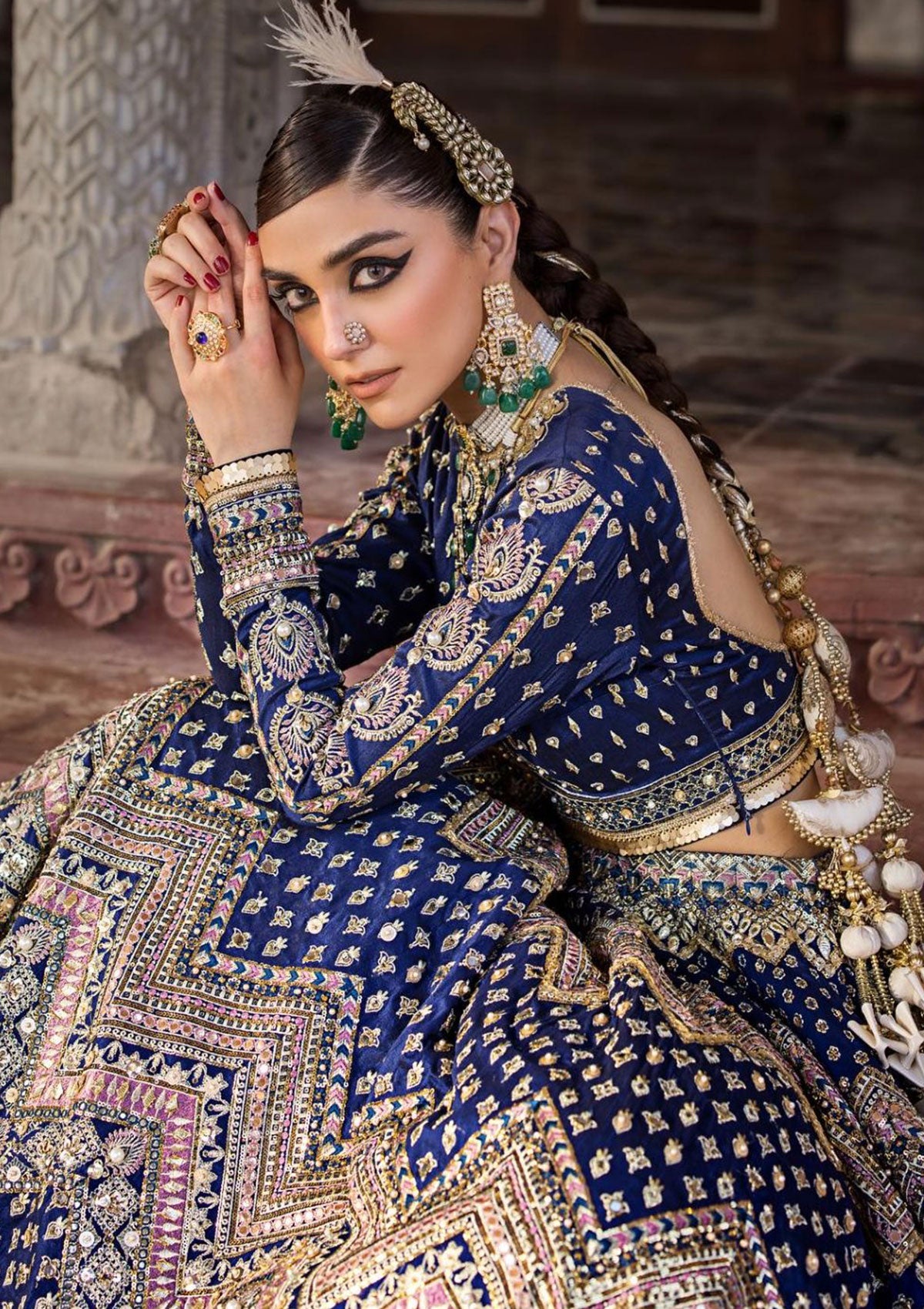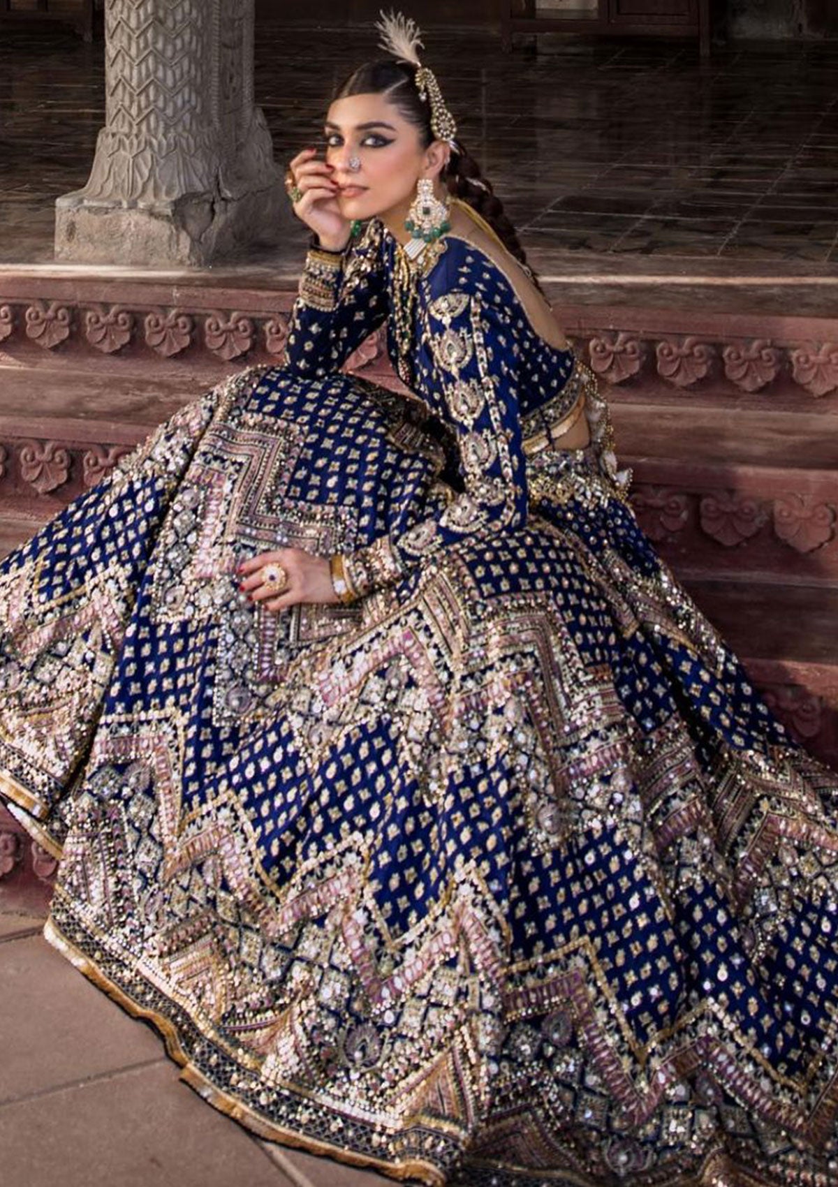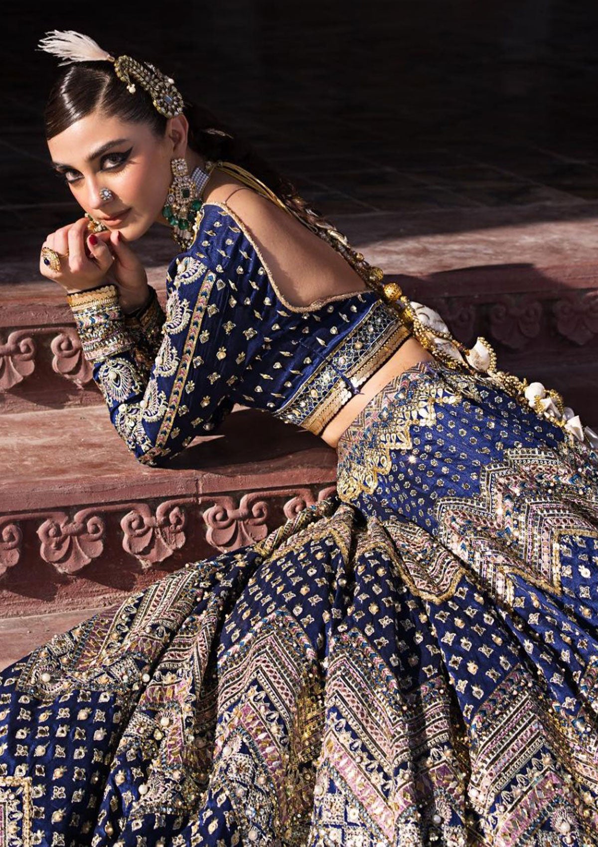 Prepare to be mesmerized by the 'Shah Taj' ensemble, a traditional lehenga choli that emanates the majestic allure of sapphire blue. This masterpiece features an exquisite blend of craftsmanship, with 16 intricately embroidered and embellished panels on raw silk. The mirrorwork, sequins, pearls, and naqshi work adorn every inch, creating a shimmering tapestry of opulence. Chevrons dance along the lehenga, mirroring the techniques on the bodice and sleeves. To complete this regal look, an organza embroidered dupatta adds a touch of sheer elegance. 'Shah Taj' is the epitome of grandeur and tradition, an ensemble that promises to leave an indelible mark on any bride's special day.
