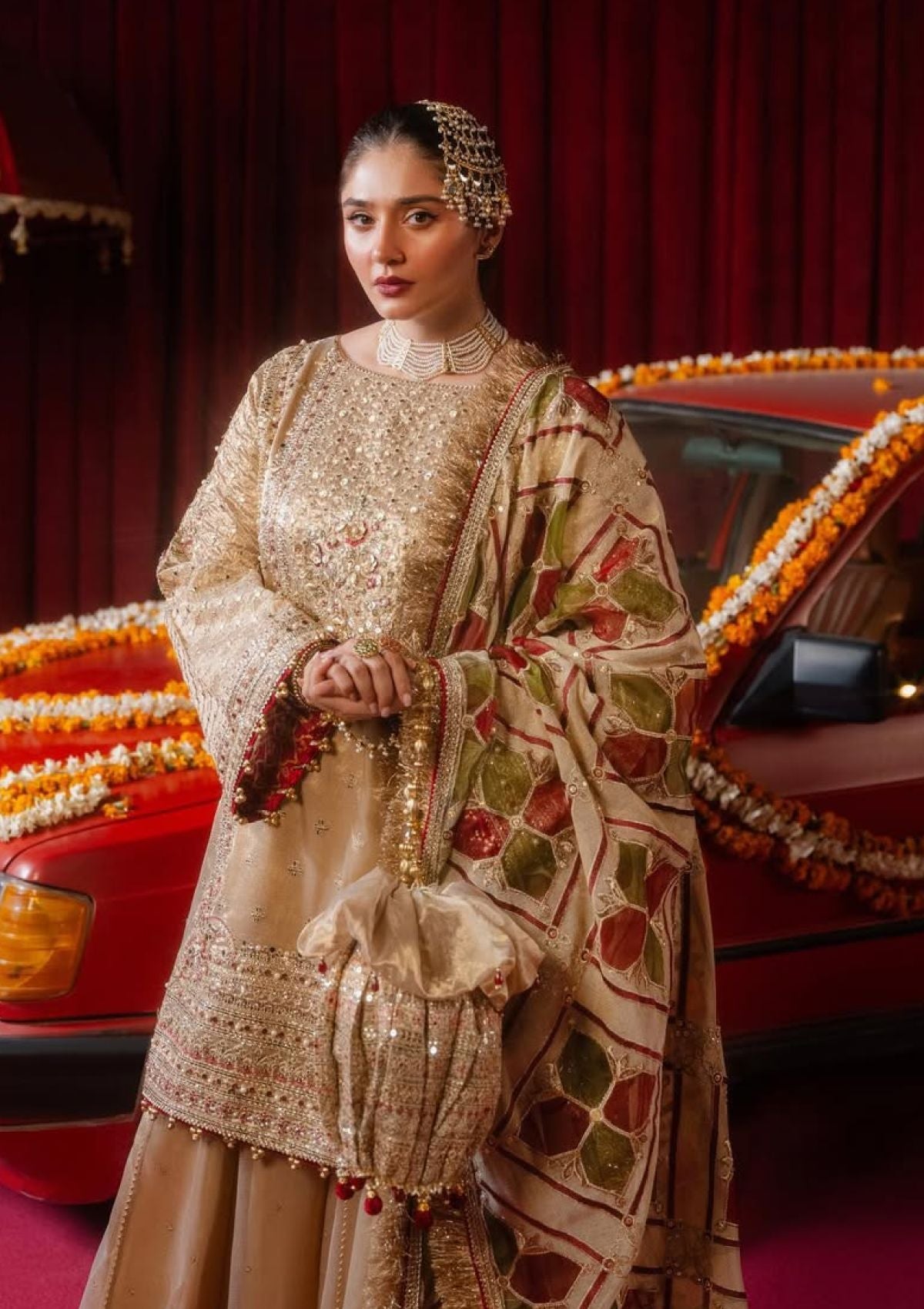 Step into the opulence of "Khushi" from MNR's Dur-e-Nayab 2024 unstitched collection. This dazzling gold ensemble, crafted from luxurious tissue fabric, features intricate thread and tilla embroidery, shimmering sequin work, and delicate panni embellishments. Hand-embellished sequins and pearls add a luminous sparkle. The elegant sharara pants, with a spray of sequin motifs, elevate the graceful silhouette. Paired with a striking tissue dupatta, featuring laser-cut geometric shapes patched with rich red and green organza exudes bold elegance.