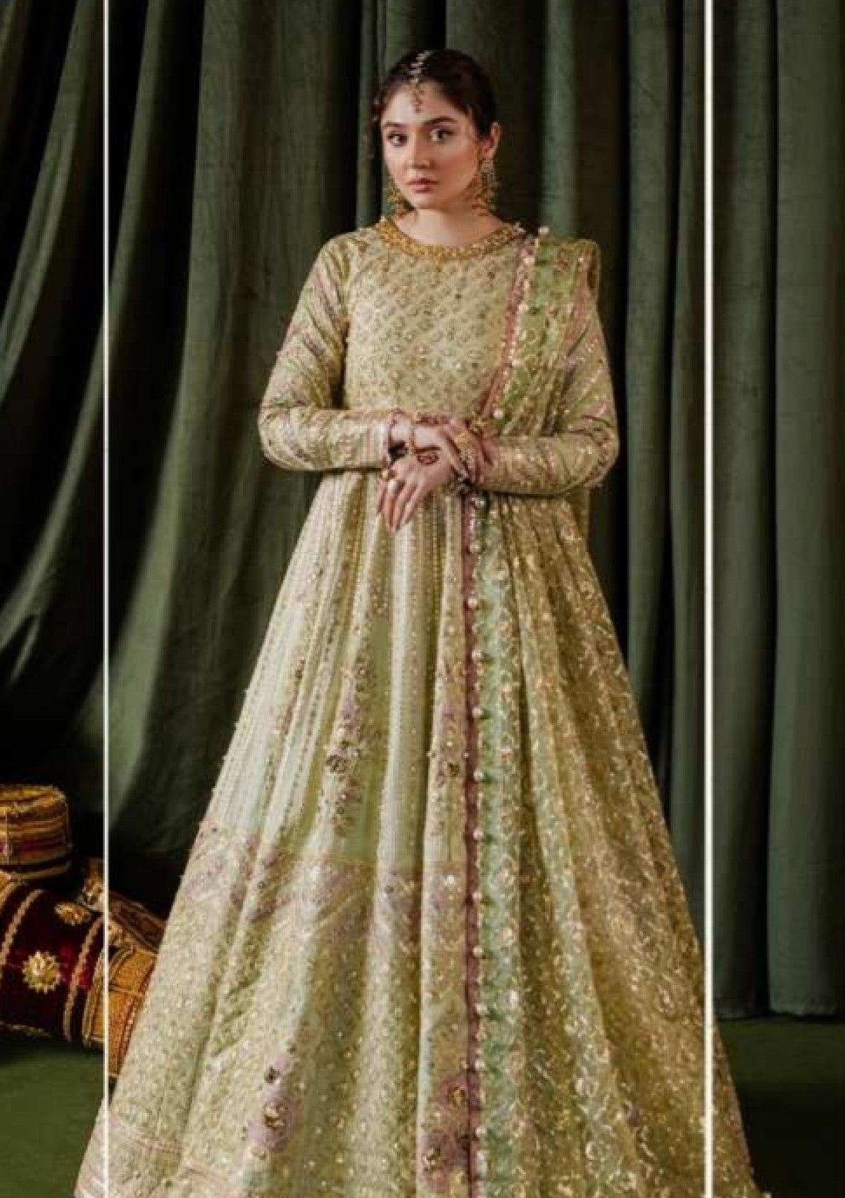 Step into the timeless elegance of "Mastani" from MNR's Dur-e-Nayab 2024 unstitched collection. This serene pistachio green ensemble, crafted from luxurious Indian silk, showcases masterful tilla embroidery, shimmering sequin work, and delicate panni details. Hand-applied pearls and sequins add a luminous touch to the intricate design. Unique embroidered panels and a full hem border create depth and grace. The matching organza dupatta, with its sequin-embroidered pattern, enhances the ensemble's ethereal charm, while a satin silk belt ties it all together.