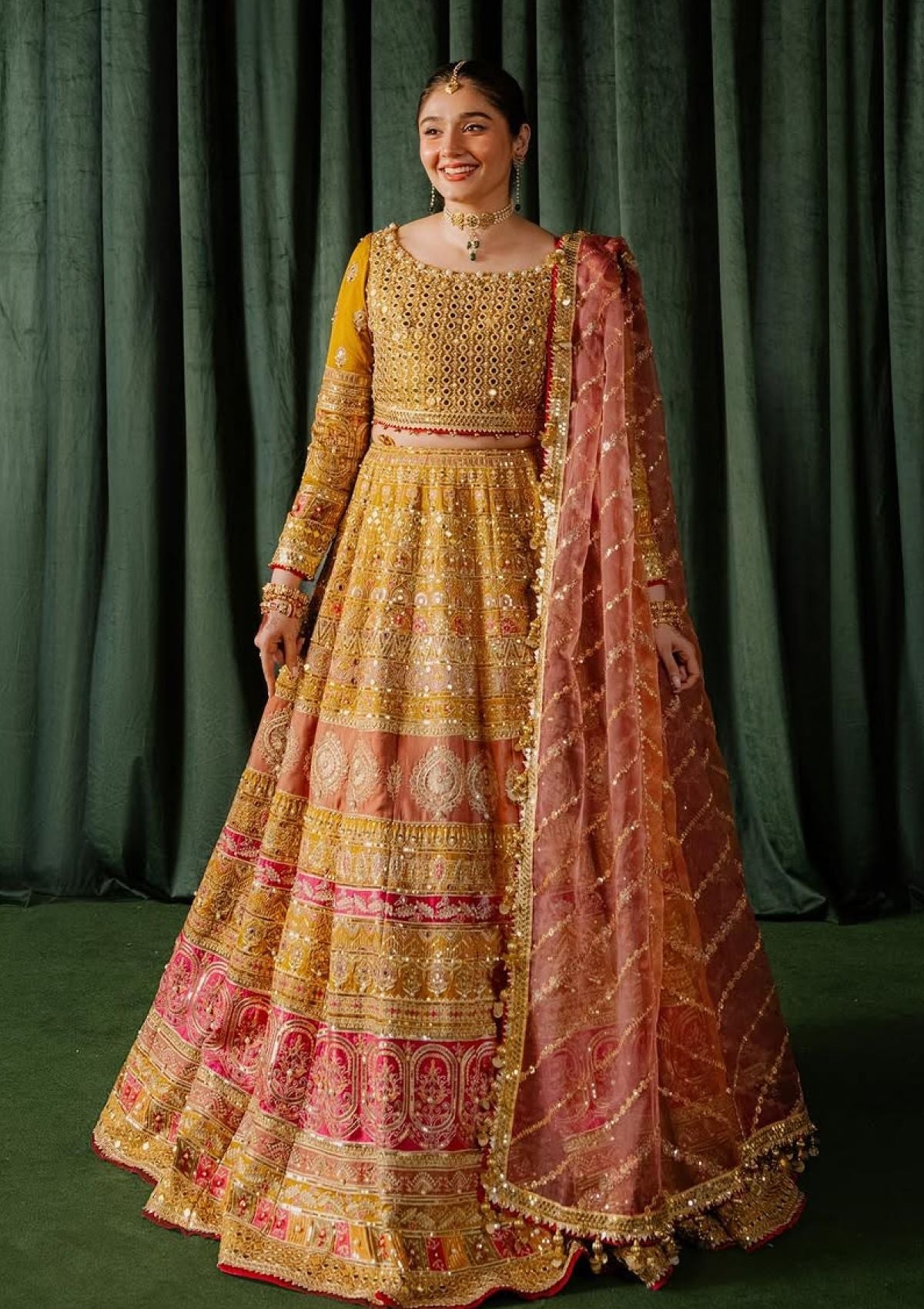 Enter the world of "Meher" from MNR's Dur-e-Nayab 2024 collection. This mustard lehenga choli, crafted from rich Indian silk, showcases intricate thread and tilla embroidery, sequin work, and hand-applied pearls that shimmer with every movement. Pale pink satin silk patches on the lehenga create a striking contrast, while a three-toned pink organza dupatta with a chevron pattern and a delicate border adds an elegant touch.