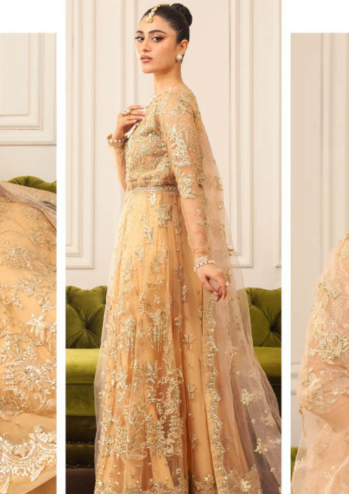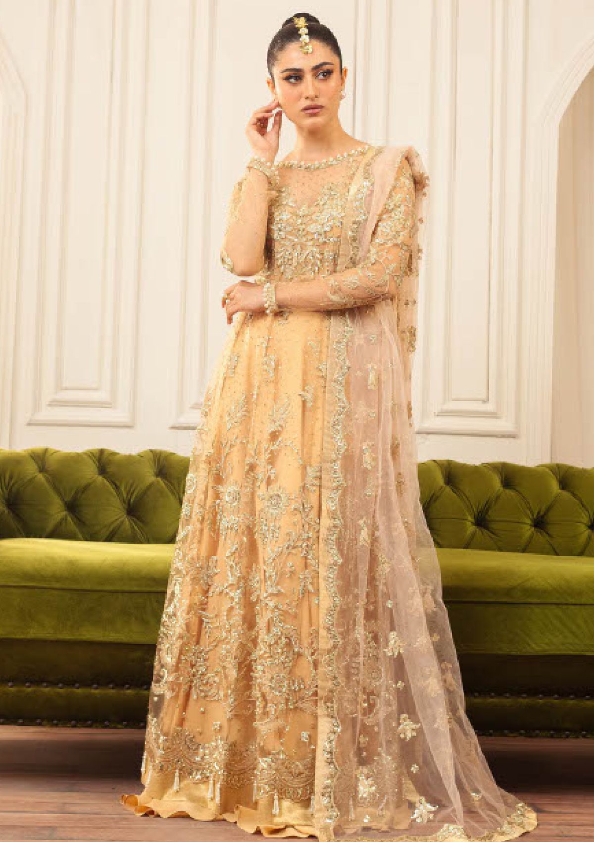 - Embroidered, sequinned & hand embellished front yoke (net)