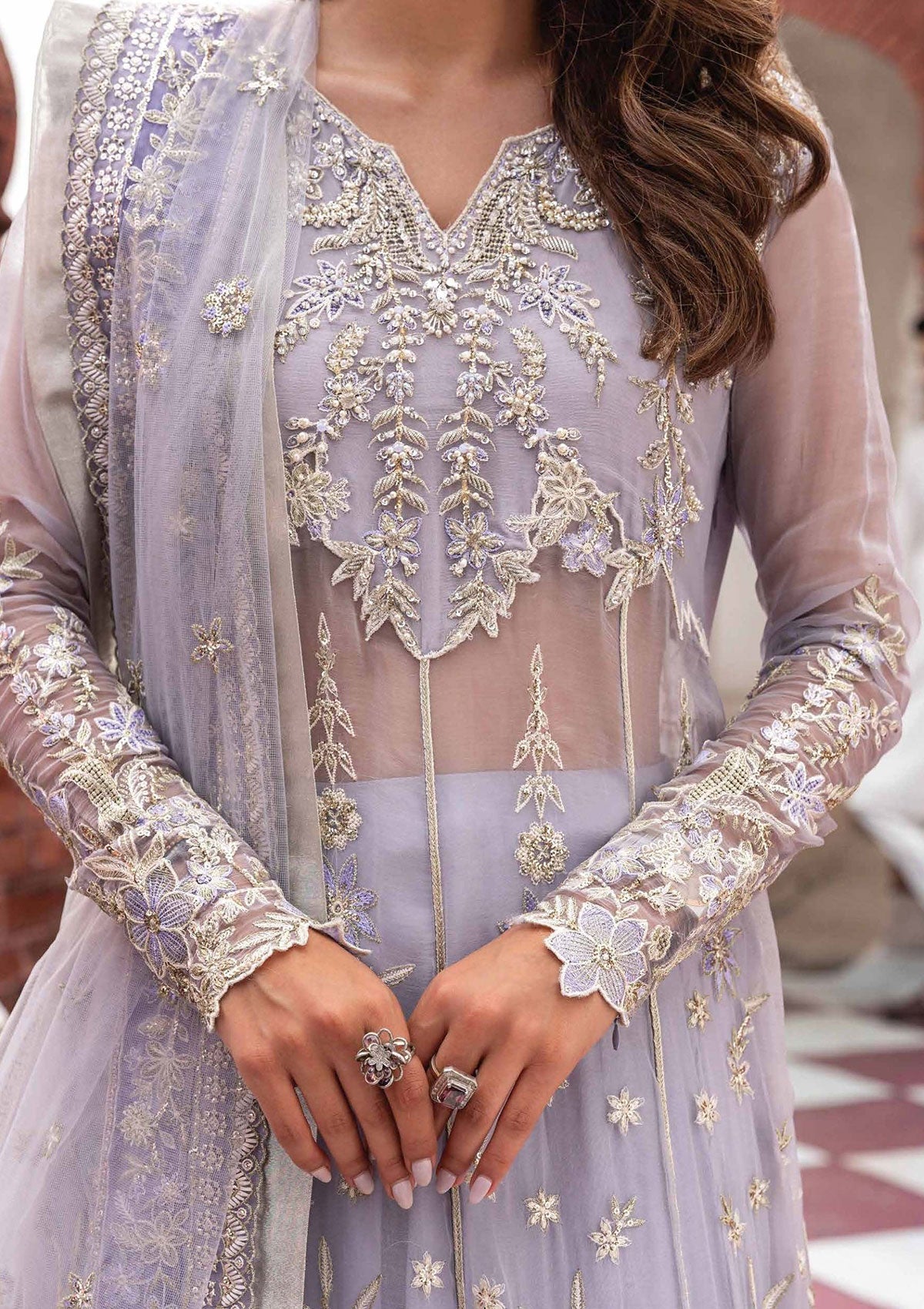- Indulge in the allure of hand-embellished and exquisitely embroidered details that adorn every inch of our ensemble Nureh rendered in lilac hue. Crafted with meticulous precision, the intricate patterns on chiffon and shimmering accents with golden gotta lace finishing and embroidered borders create a mesmerizing tapestry of design, evoking a sense of regal grandeur.