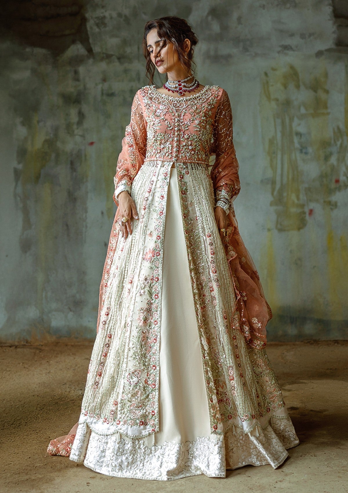 A symphony of cream and coral brought to life with intricate embroidery, sequins, and hand embellishments. From the delicately crafted net panels to the opulent silk lehenga adorned with golden and silver naqshi balls, pearls, and handmade tassels, every detail speaks of timeless grace.