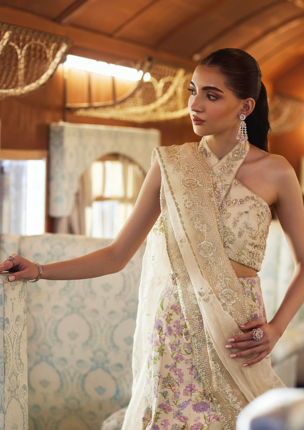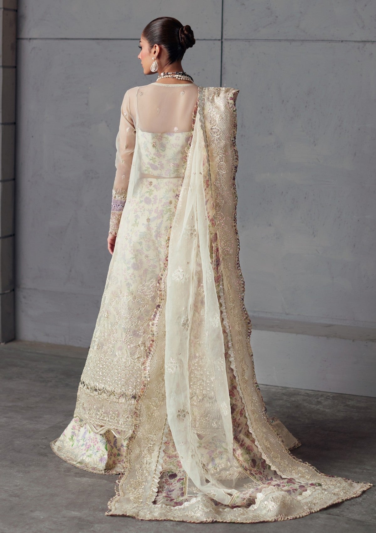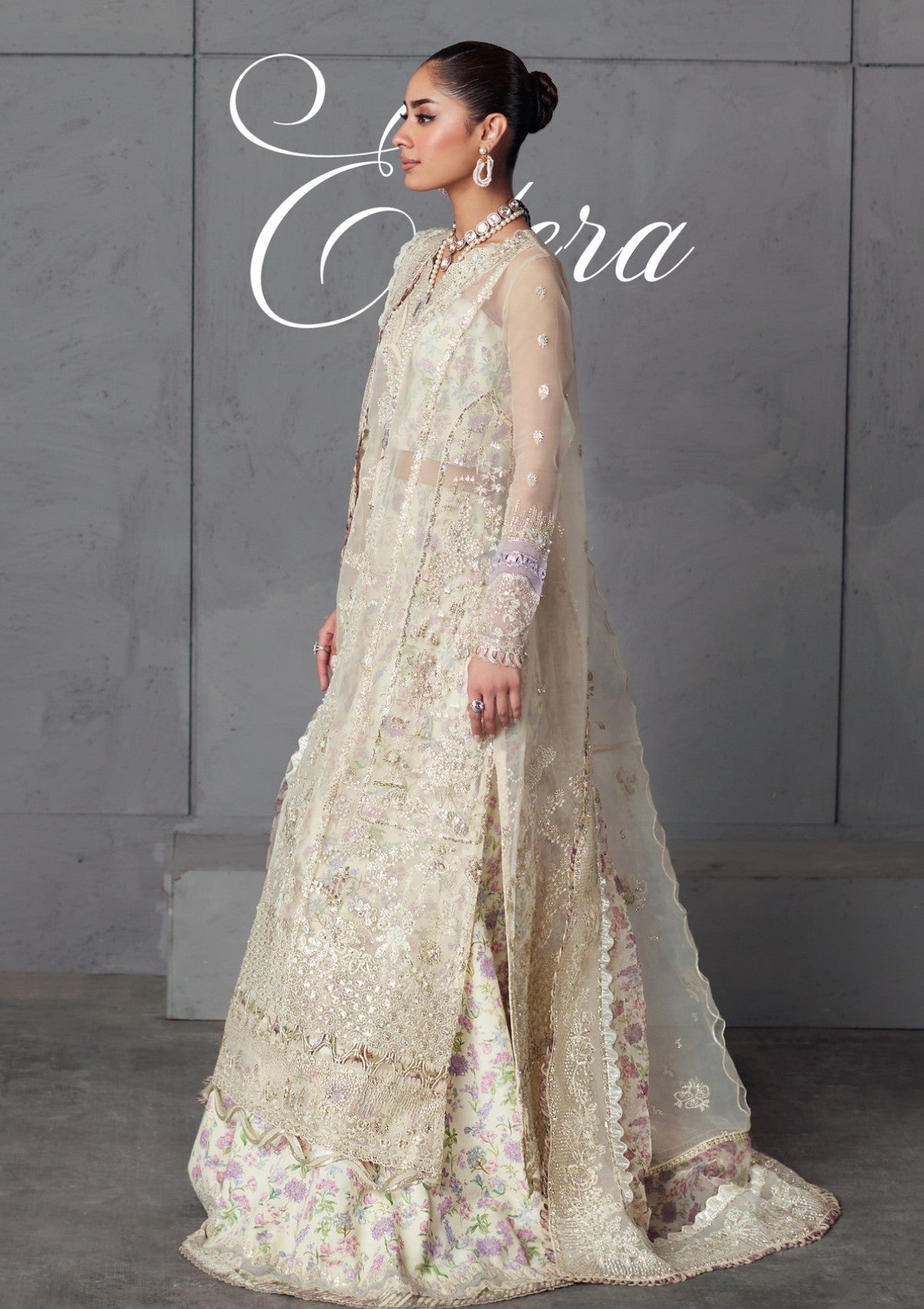 - Edera, enshrouded in purity featuring a 3-panelled shirt in perfect tone of white serves as a canvas with exquisite hand embellishments, a testament to the art of true craftsmanship. The shirt's shikargah and floral inspiration is beautifully balanced by delicate arches on the side panels, while the lilac and pink floral lining adds a whisper of romance to the look. The dupatta is crowned with scalloped embroidered borders and addition to it is a floral printed border on all sides. To extend the elegance of the outfit is this intricate cutwork spiral design that completes the ensemble, creating a captivating visual symphony.