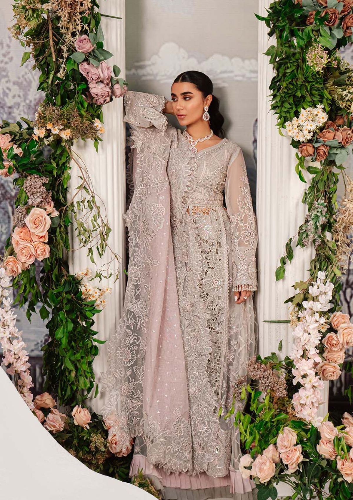 Presenting âÃÂÃÂLaira' metallic grey ensemble that weaves an intricate symphony of delicate femininity and youthful allure.This grandeur creation is a testament to divine subtlety, gracefully enveloping the opulent fabric with its enchanting artistry. Adorned with a harmonious blend of dazzling sequins, crystal and seed pearls are delicately placed by hand onto the silver thread worked blooms, creating a divine composition. Paired with a soft pink dupatta with elaborately embroidered borders and pallus, this ethereal silhouette is simply divine.Disclaimer: The color of the outfit may vary due to the lighting effect used in the photography.