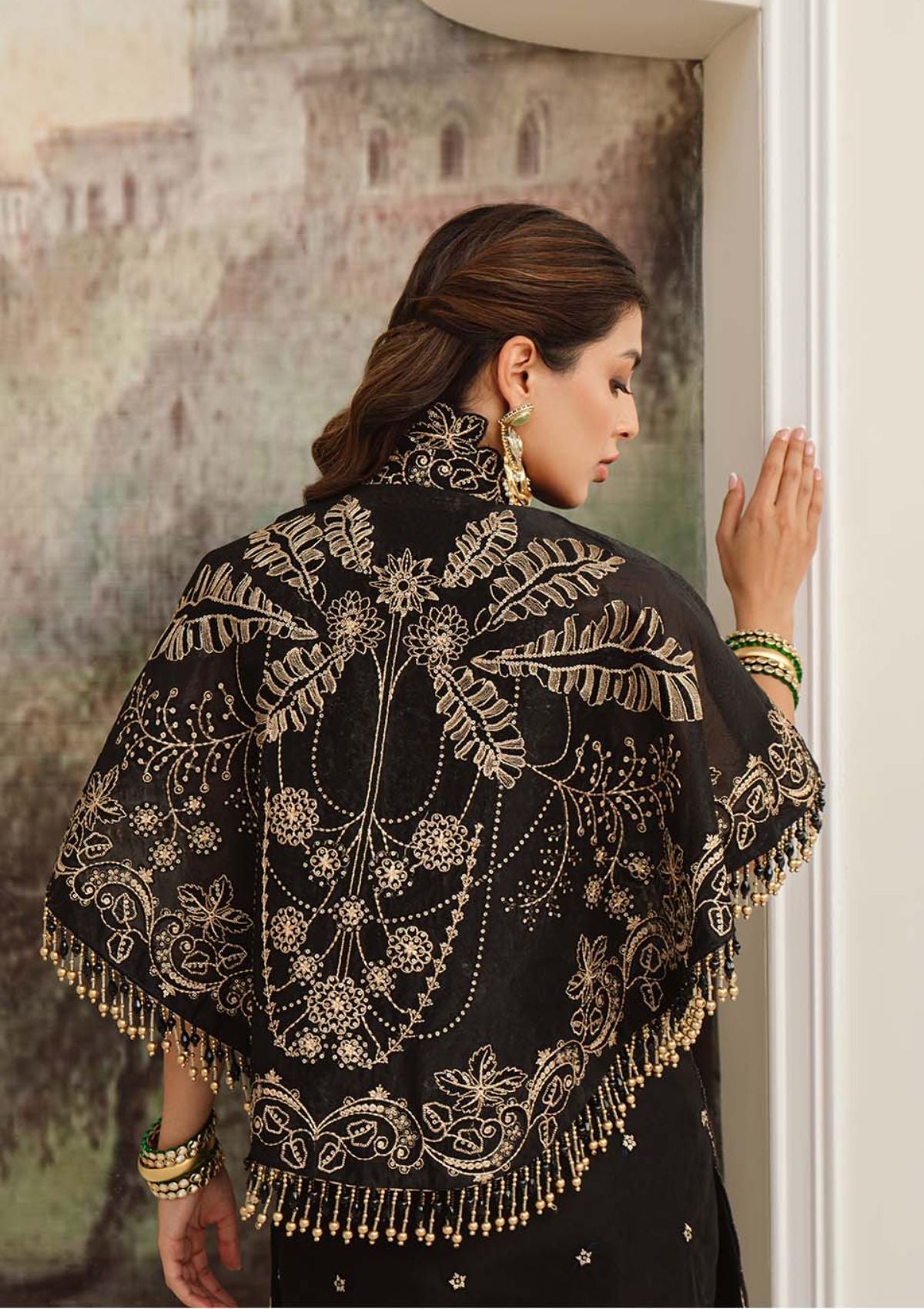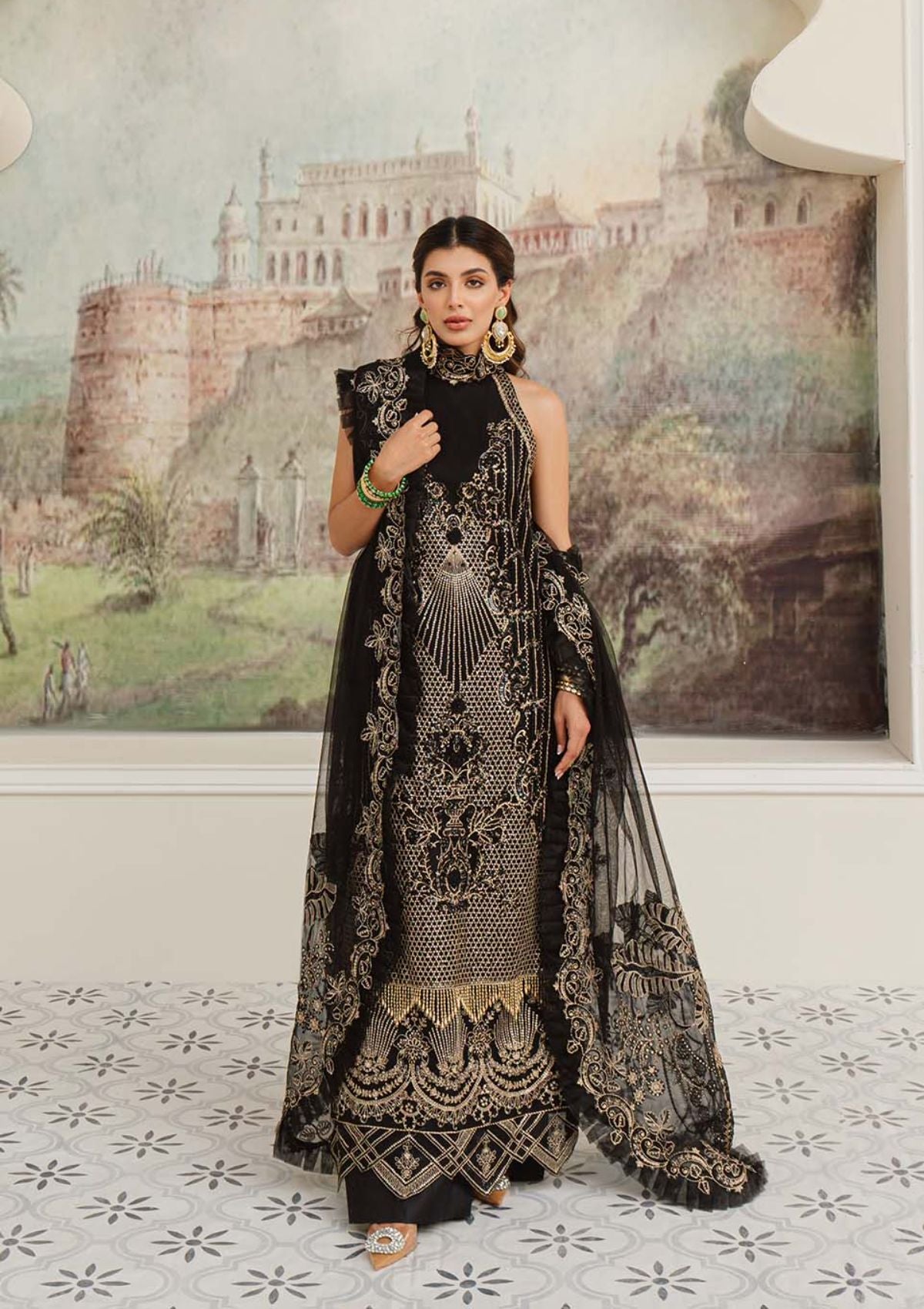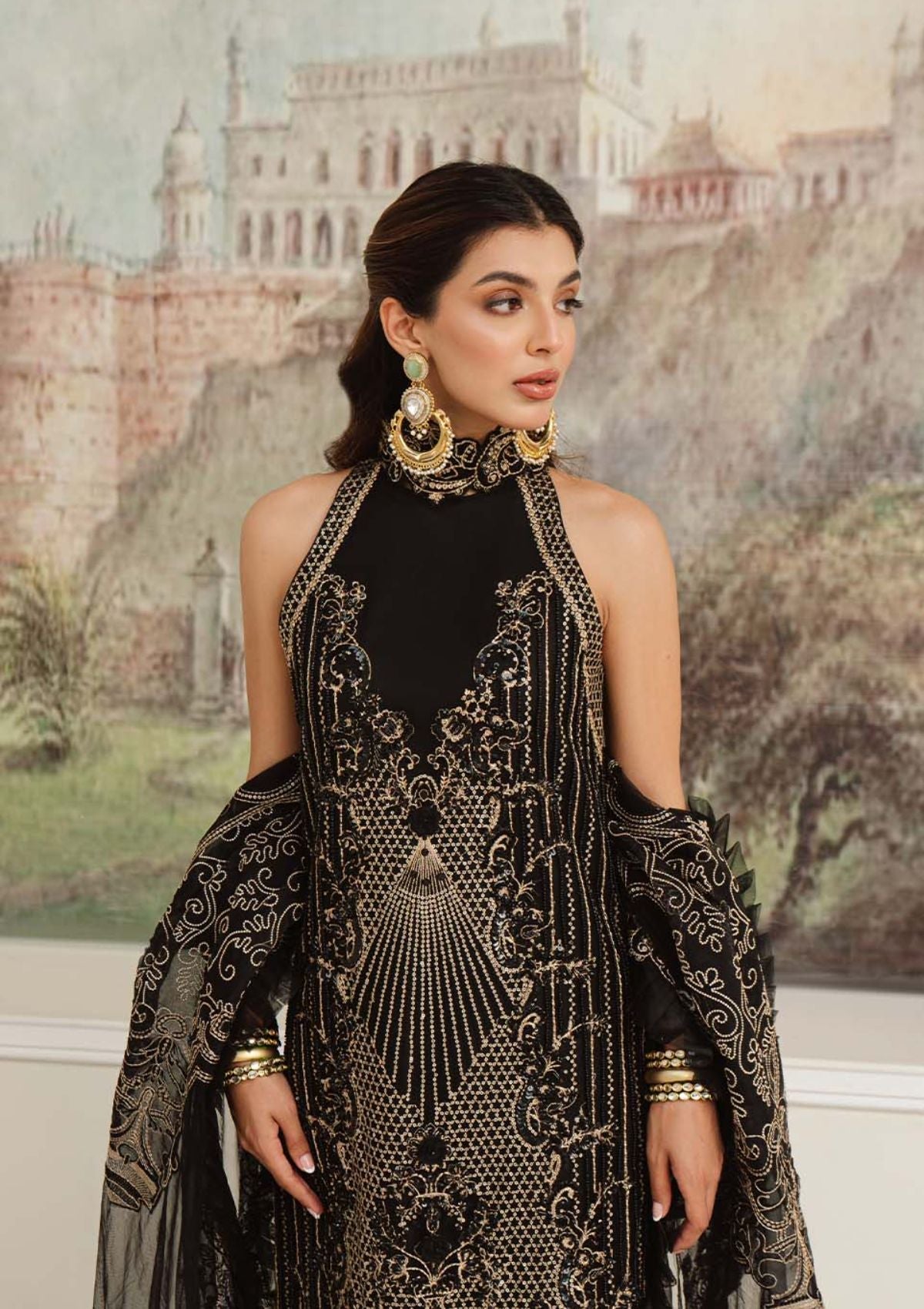 Float your way through the festive season clad in the meticulously crafted âÃÂÃÂLILA'. A classic silhouette in ebony features a fully embroidered shirt hand encrusted with obsidian crystals, pearls and sequins to form a scintillating, lattice composition. This richly embroidered design is paired with an exquisitely elaborate dupatta rendered with embroidered borders and oversized dreamy bouquets framing the pallus. This final design of our collection is a masterpiece that will stand out in every formal and festive gathering .