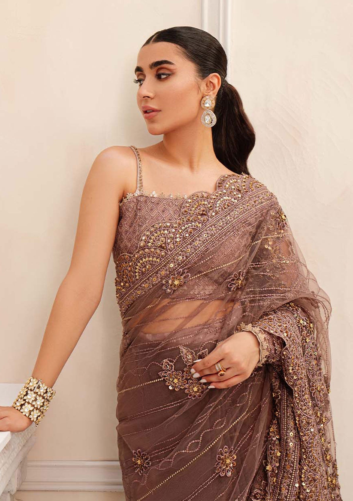 A soft raisin mauve is adorned with intricate gold threadworm, delicate beads and glistening sequins in âÃÂÃÂNORA'. The elegant flowing saree is crafted from ethereal net admitted with beautifully delicate florals and motifs to create a timeless work of art. It comes paired with a lusciously embroidered embellished blouse with meticulous detailing to leave an everlasting impression.