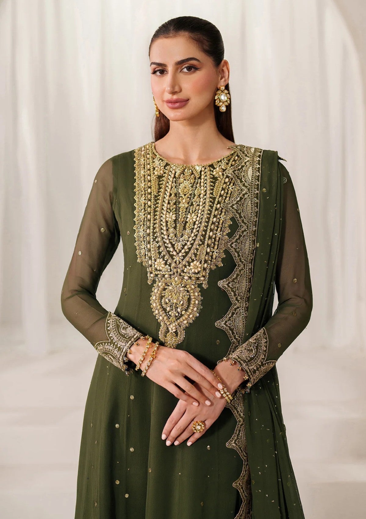 Turn heads in this exquisitely designed deep olive green ensemble, featuring a Mukesh-detailed front panel and black kali accents for added elegance. The sleeves are adorned with delicate Mukesh work, while the neckline is finished with a heavily embroidered patch, adding a regal touch. Finished with a scalloped dupatta and embroidered borders, this outfit is perfect for festive or formal occasions