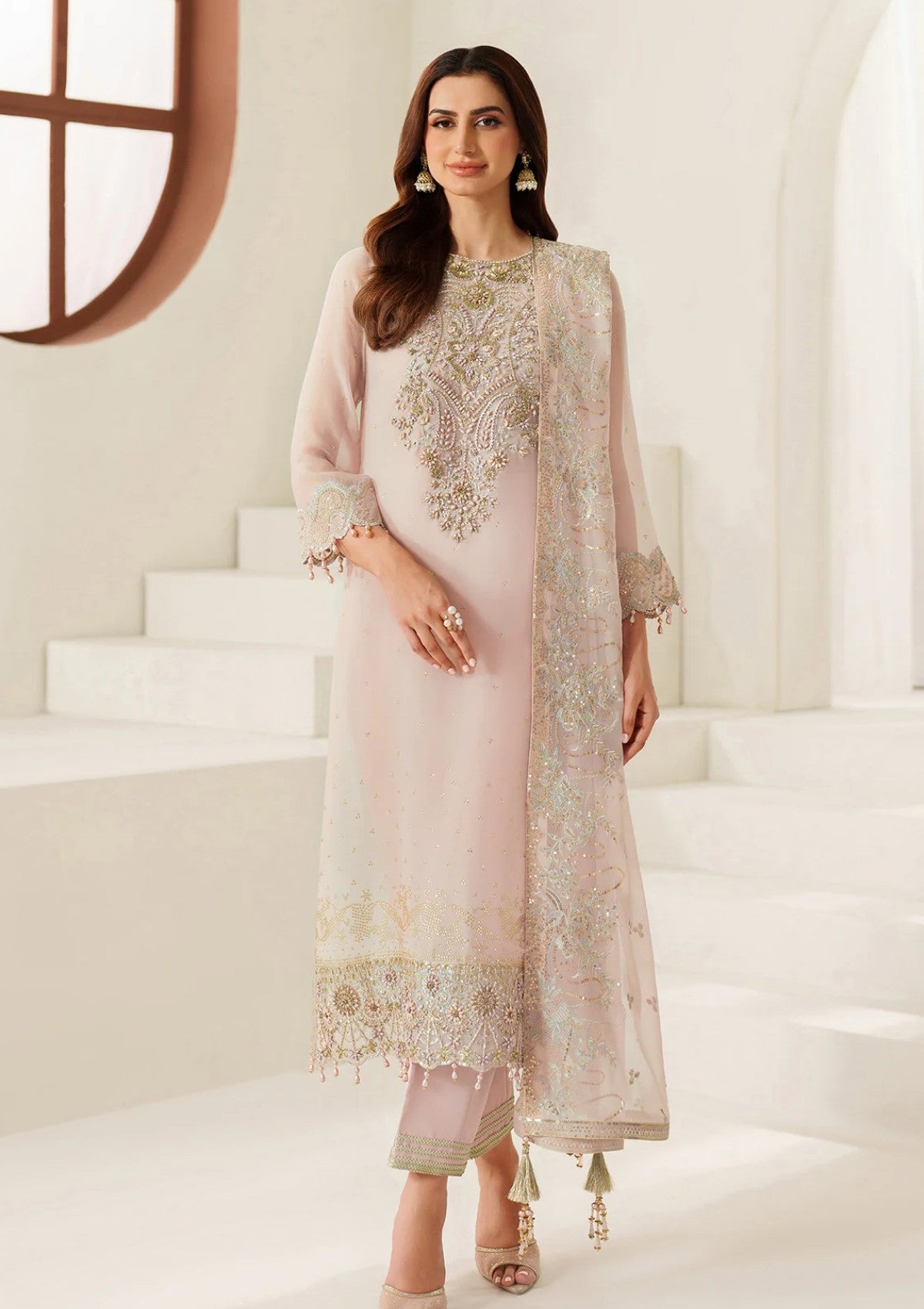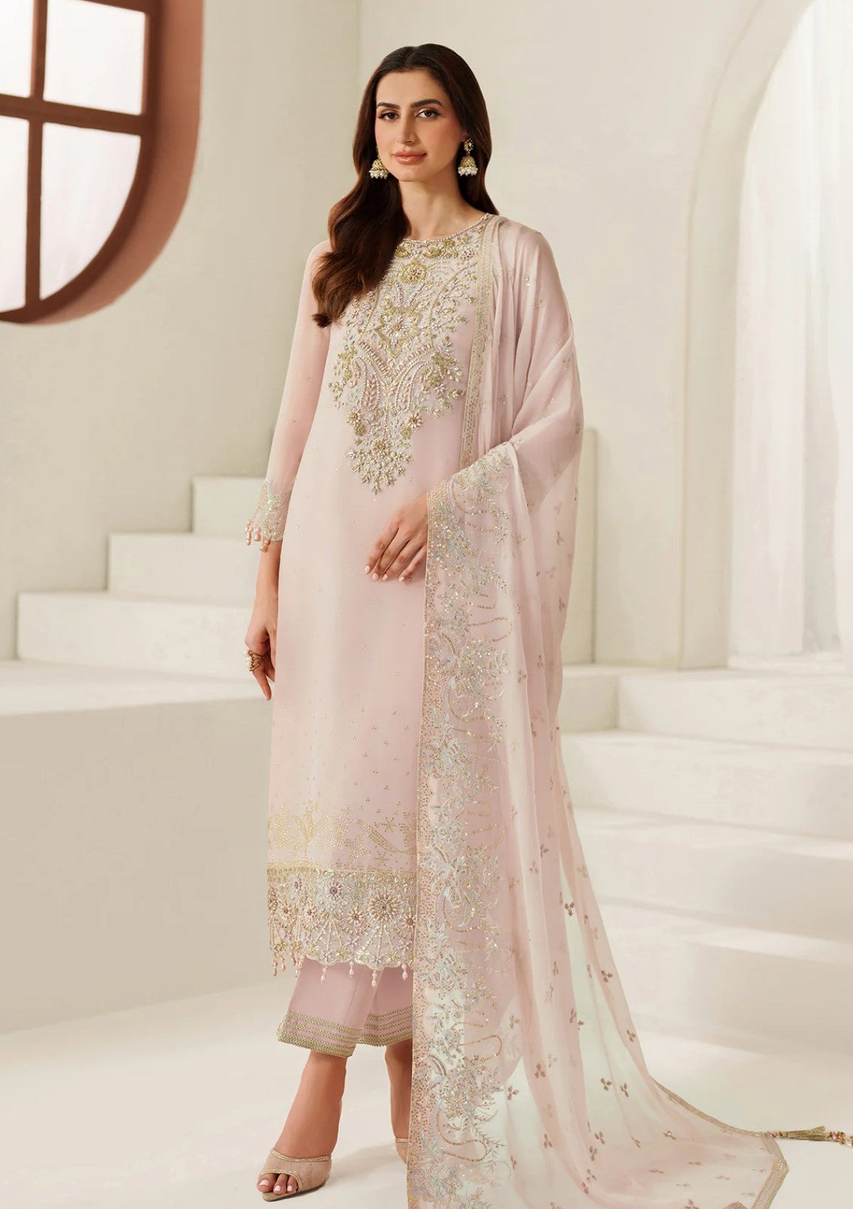 Drape yourself in understated luxury with this blush pink outfit, adorned with a stone-studded front and sleeves that add just the right touch of shimmer. The meticulously embroidered front reflects expert craftsmanship and timeless design. Styled with a matching embellished dupatta and complementing trousers, perfect for those who prefer elegance over extravagance
