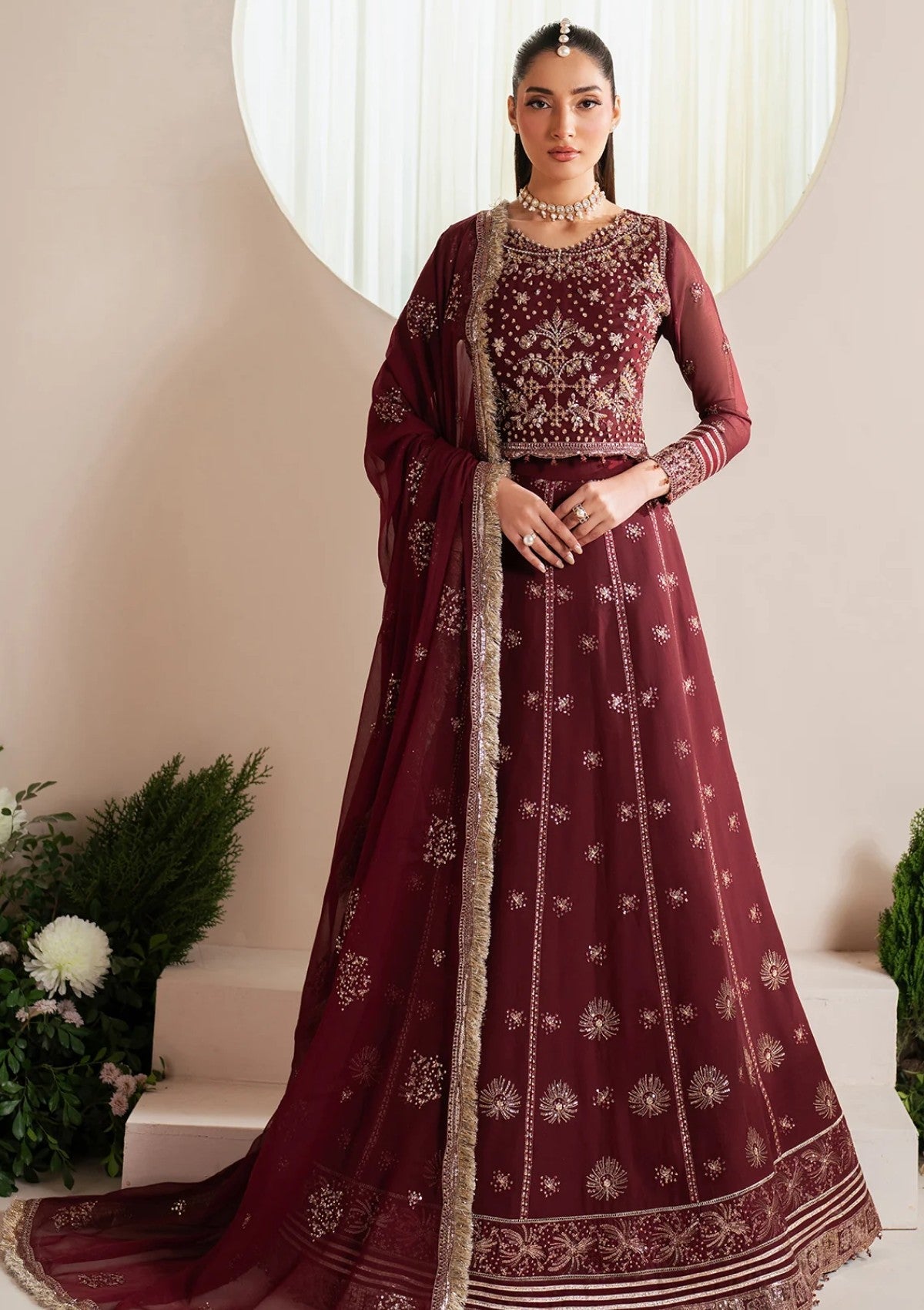 The"Empress"ensemble features a luxurious deep redchiffonoutfit, adorned withintricate copper-goldhand embellishments and shimmering embroidery details. Paired withRussian grip trousers, thelookis elevatedby a beautiful chiffon dupatta, with a stunning embroideryadding a touch of opulence and refinement.