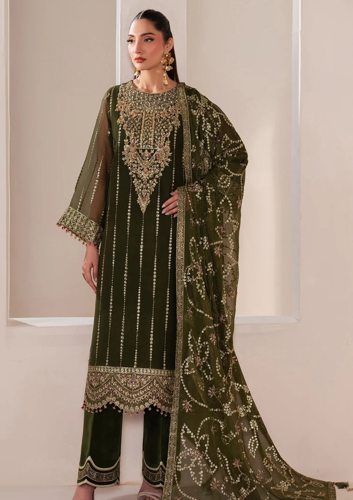 The"Olivia"ensemble is a striking piece, showcasing an olive green chiffon shirt with a meticulously hand-embellished neckline, adorned with a stunning array of intricate pearl details for a luxurious touch. It is paired with an embroidered chiffon dupatta and Russian grip trousers, making it the perfect choice for an unforgettable festive season.