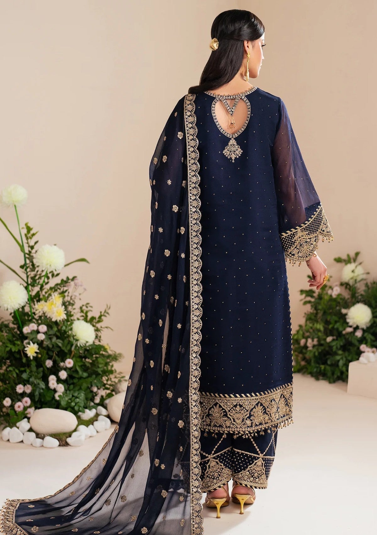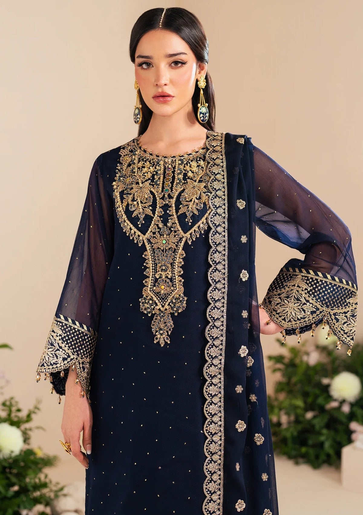 "Erina"is a breathtaking ensemble crafted from deep blue muskaish chiffon. It features delicate hand embellishments, intricate embroidery, and shimmering light gold sequins. The look is beautifully complemented by Russian grip trousers with an embroidered border, perfectly balancing the richness of the chiffon dupatta. This exquisite outfit is an ideal choice for Eid celebrations.