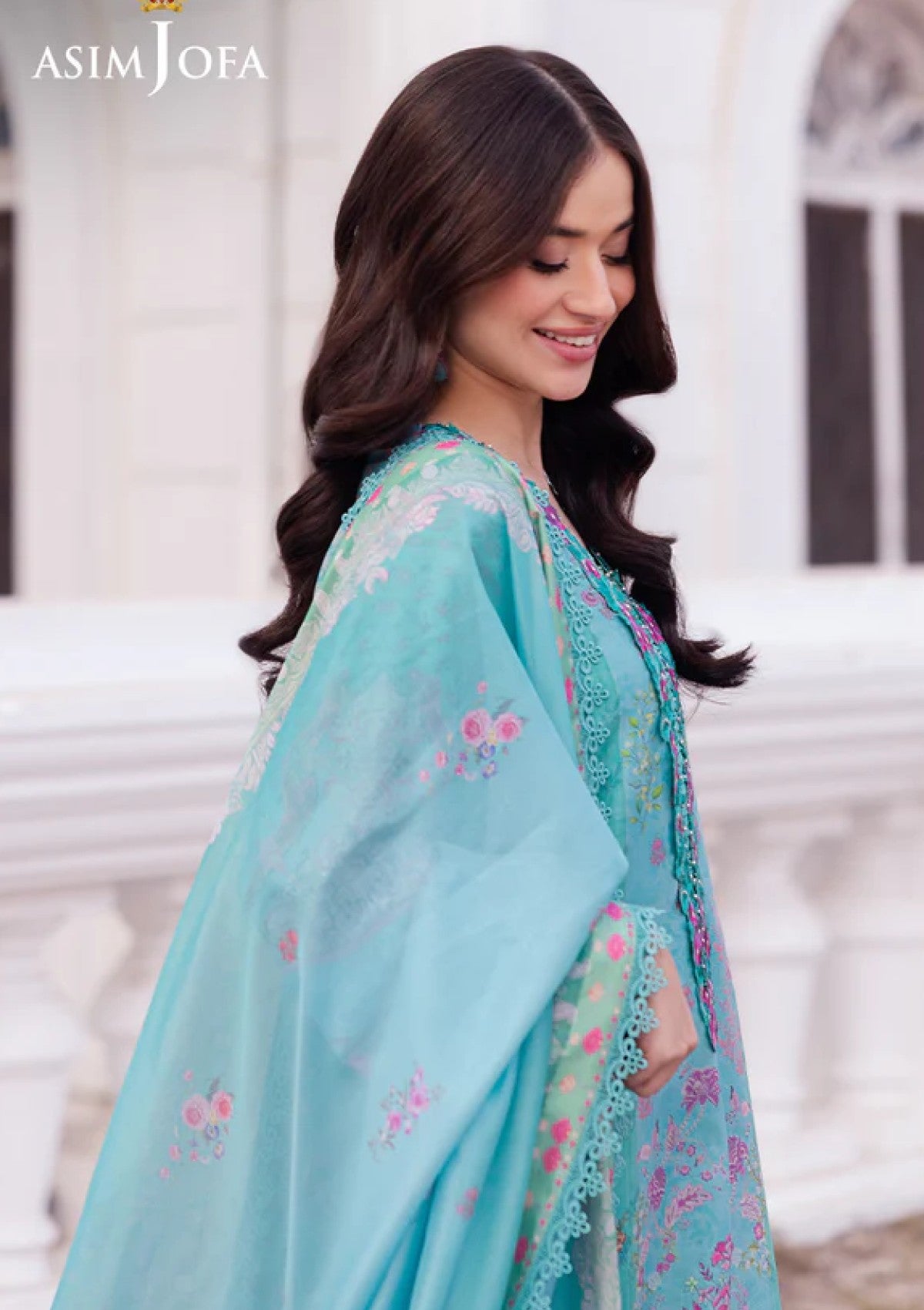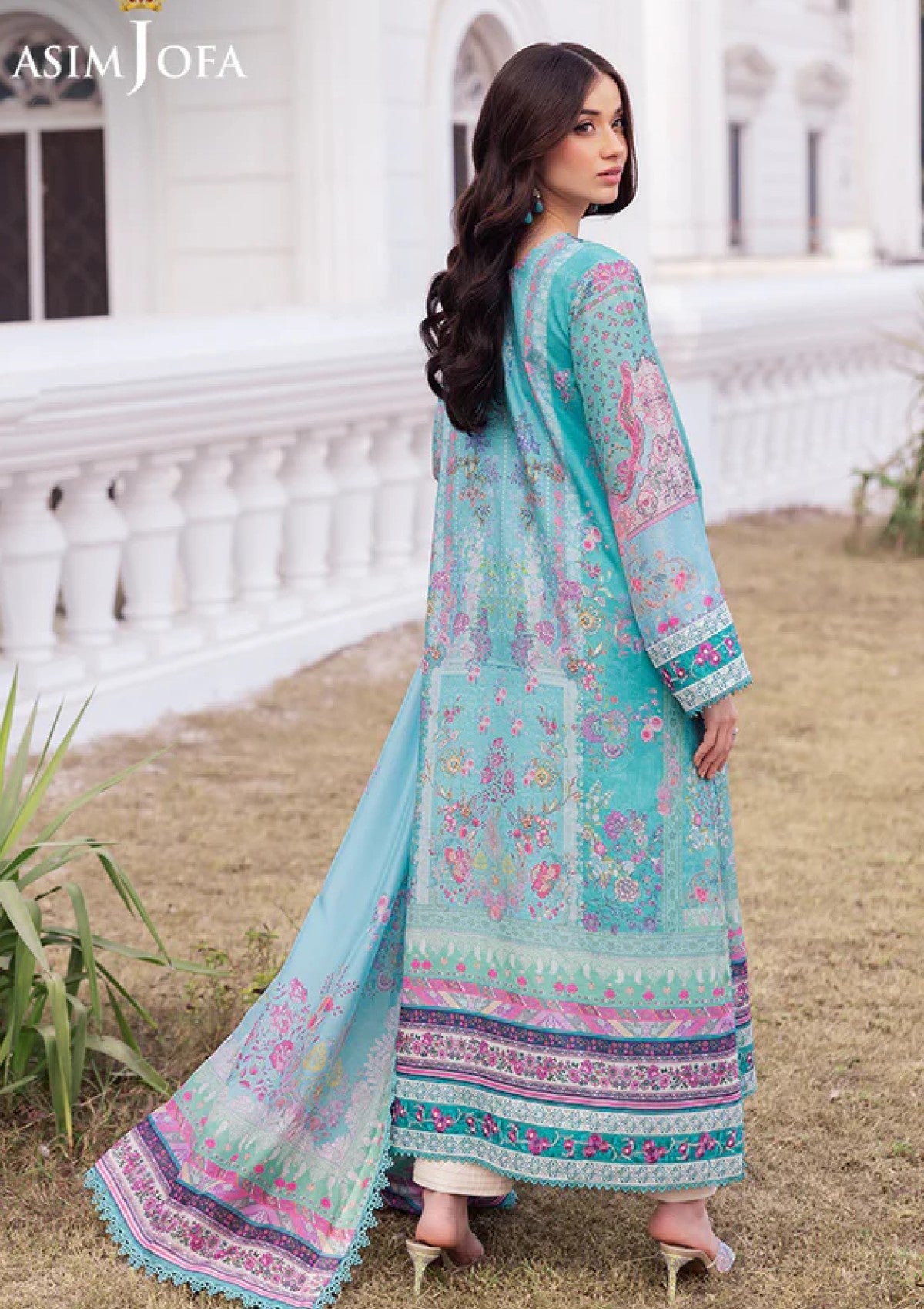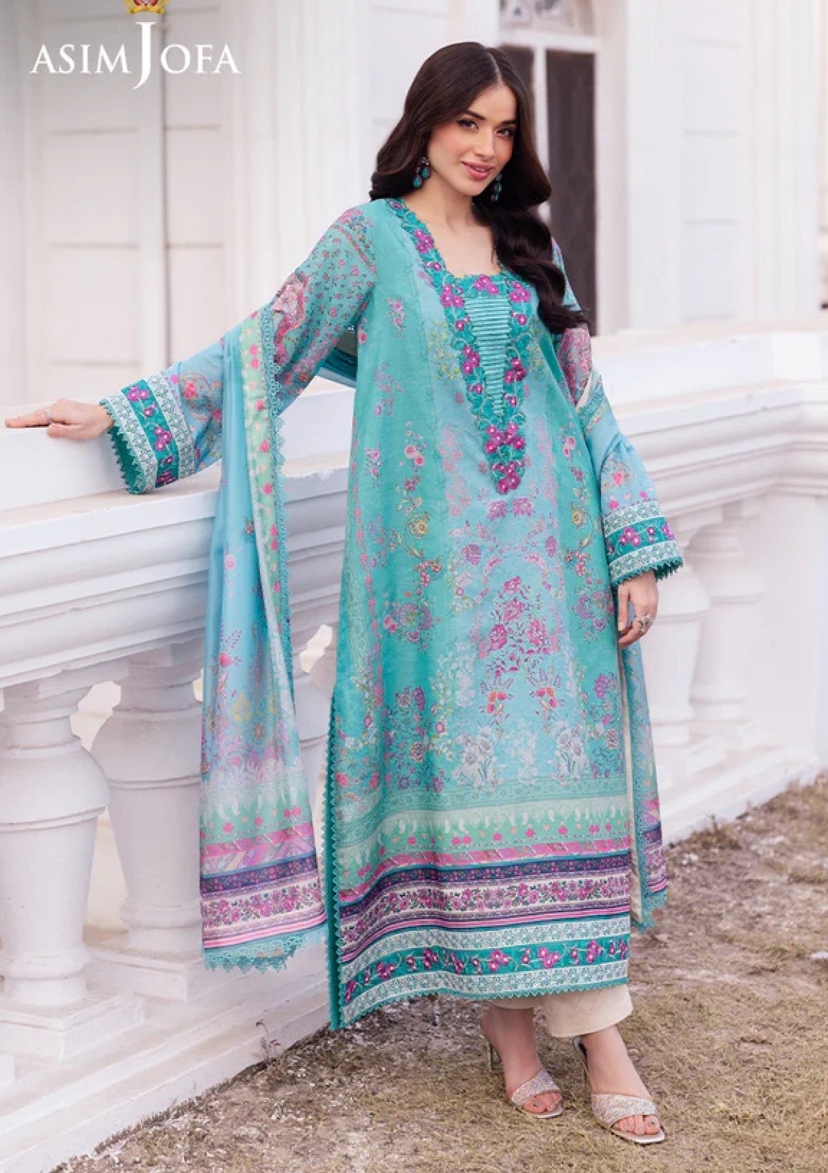 This Aqua Marine ensemble exudes a regal allure, with floral prints flourishing like a lush forest at dusk. The digitally printed aqua marine shirt features a finely embroidered neckline mirroring the intricate beauty of nature, while the embroidered sleeves and borders bring a touch of majestic splendor. Accompanied by a digitally printed silk dupatta that flows like a mint-hued breeze, this outfit is the epitome of gorgeousness, perfect for making a statement at any occasion.