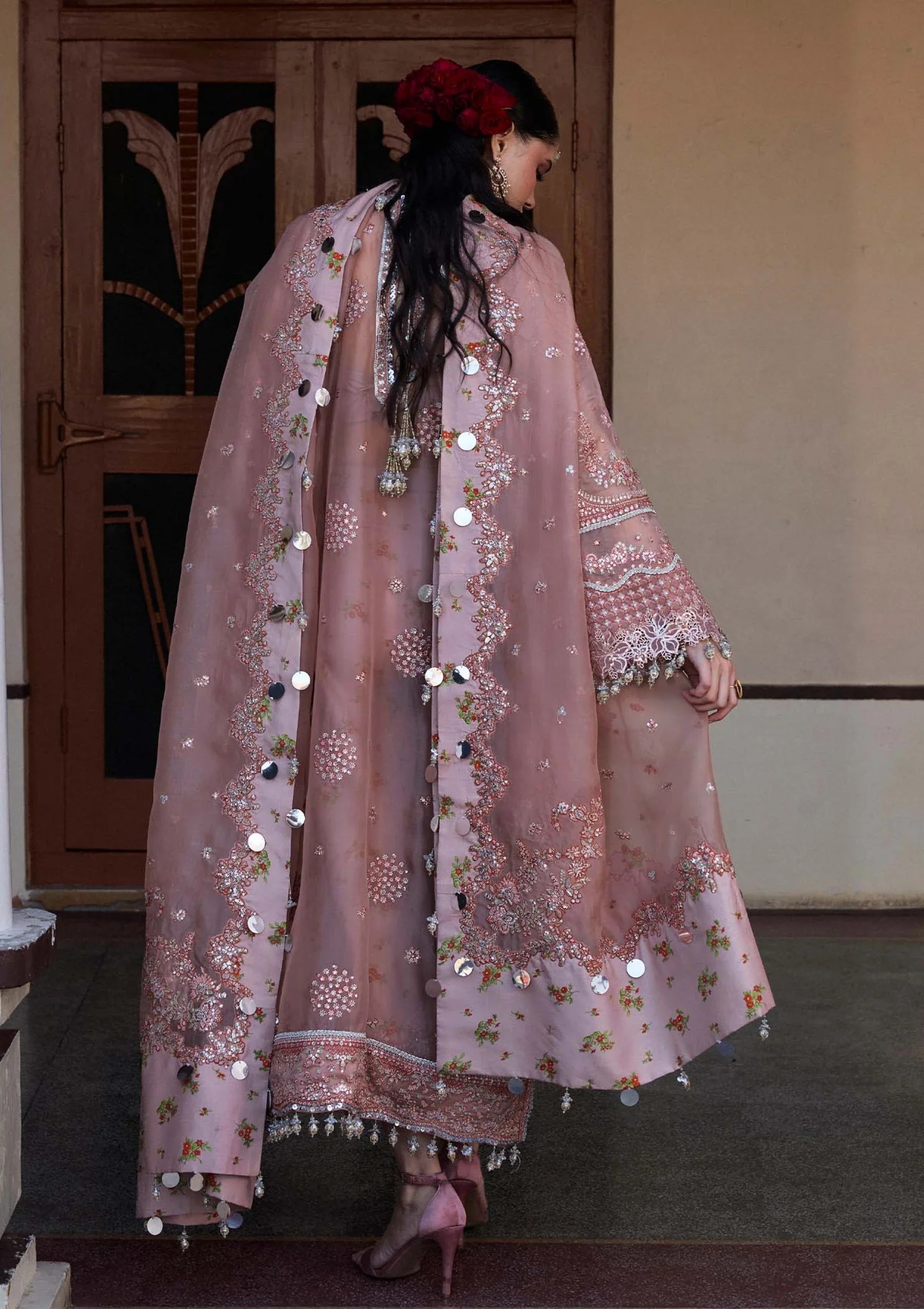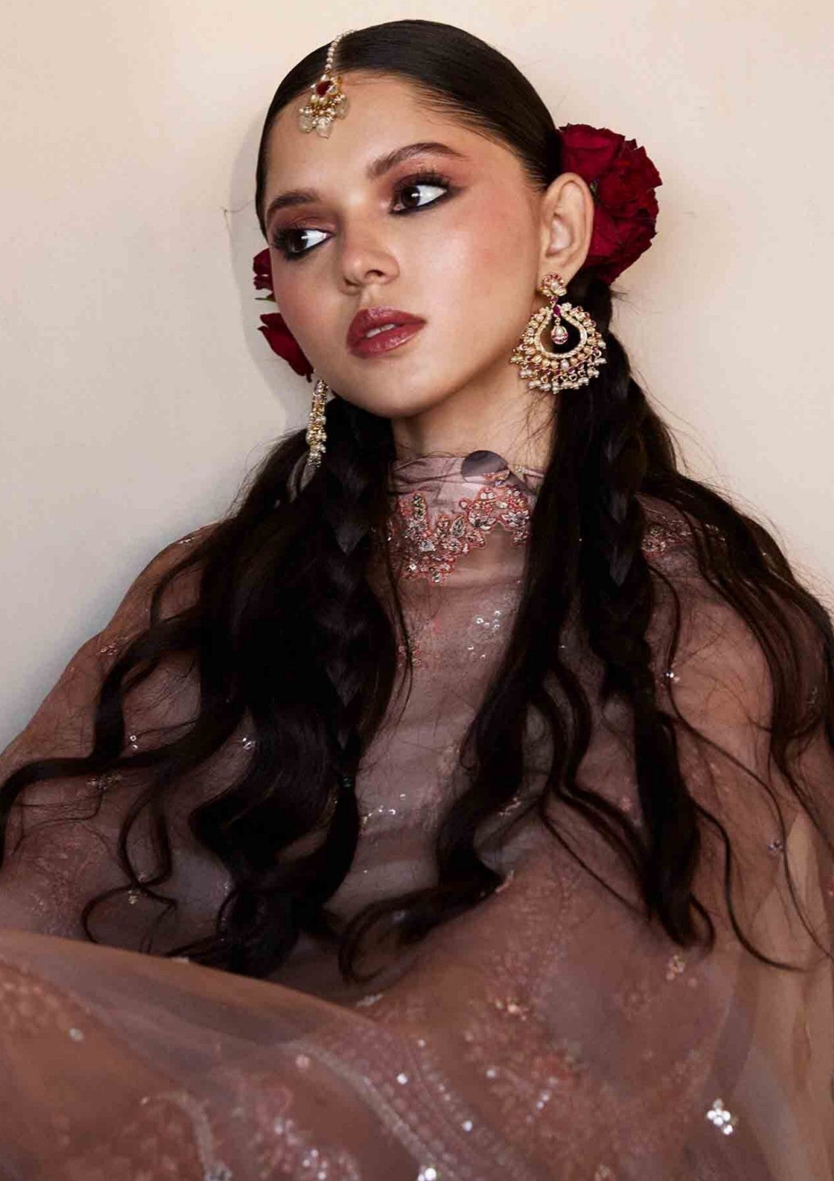 It is an organza embroidered shirt, that gives a delicateand ethereal look. Paired with floral printed KoreanRaw-silk trousers, enhance the overall look with sequins embroidered borders. As far as the dupatta is concerned, it's on organza with a sequins embroidered border which adds an intricatedetail to the entire outfit.