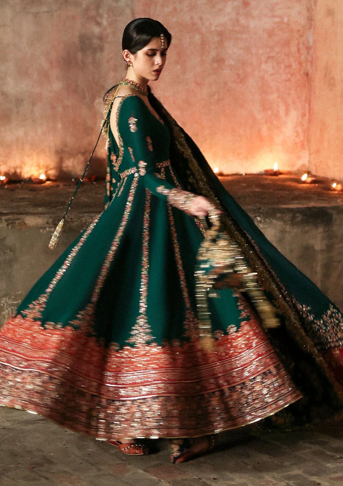 The resplendent emerald green Korean raw silk pishwas is heavily embroidered with multicolored borders and intricate detailing across front and back. It is paired with printed Korean raw silk churidar that brings vibrancy to the overall look. Completing the attire is an embroidered Korean raw silk shawl with four side embroidered borders and a multicolored printed pallu, adding a layer of grandeur. This outfit is a true statement piece for any event