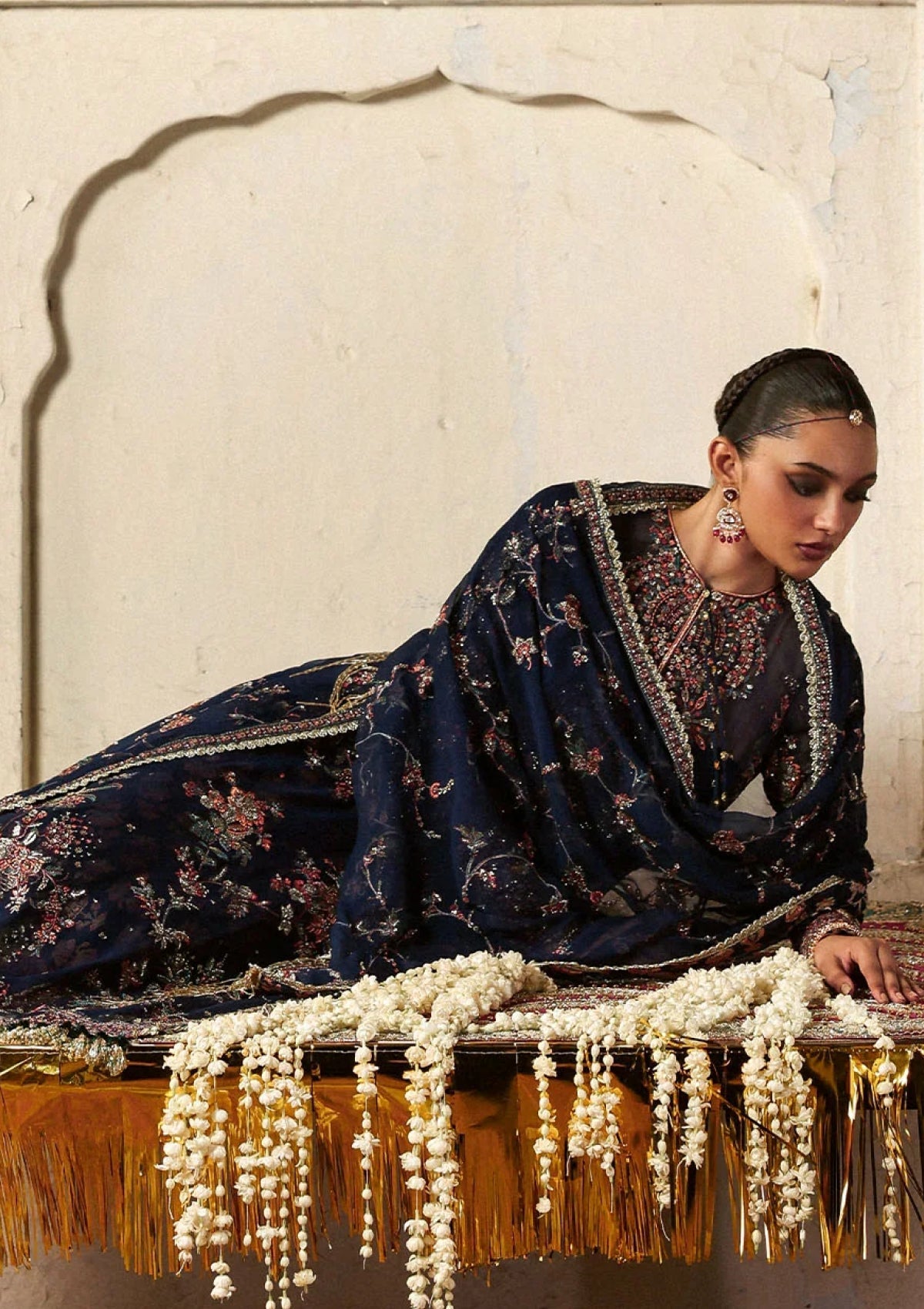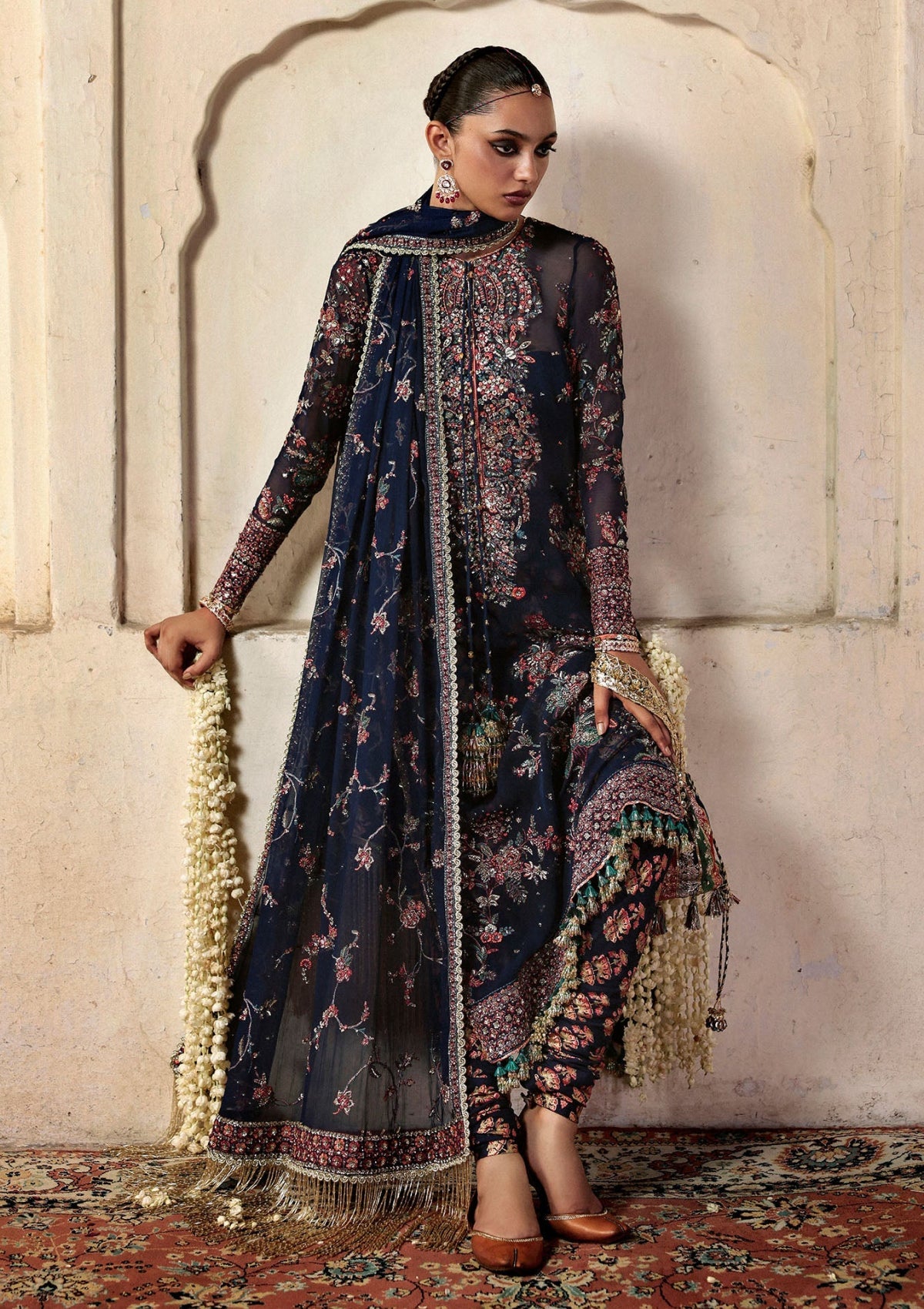 This blue chiffon shirt is adorned with a long embroidered neckline and fully embroidered front daman borders that bring depth to the design. It is paired with a Korean raw silk churidar, creating a refined balance to the richly embroidered shirt. Completing the look is a chiffon embroidered dupatta with delicate embroidery and four-sided borders and embroidered floral jaal with multicolors. This outfit offers a timeless charm with modern elegance, making it suitable for both festive and formal