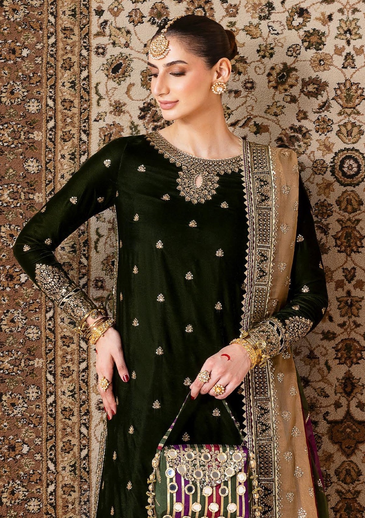This elegant formal ensemble features intricate embroidery on pure velvet across the front, sleeves, back, and borders, highlighting refined craftsmanship. The dyed raw silk bottom and its embroidered border add a rich texture, while the embroidered organza stitched dupatta complements the look with delicate detail. Perfect for formal occasions, this outfit combines luxurious fabrics and expert embroidery to ensure a sophisticated and timeless appearance.