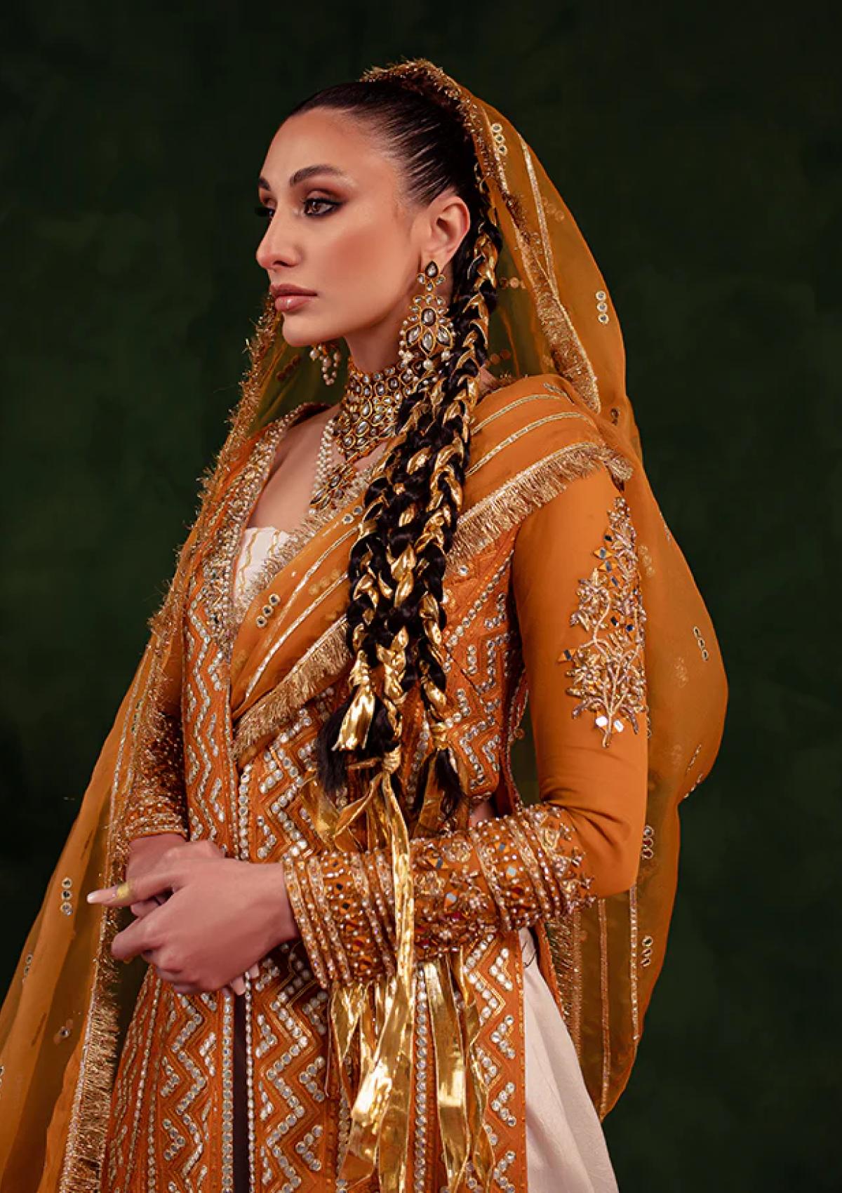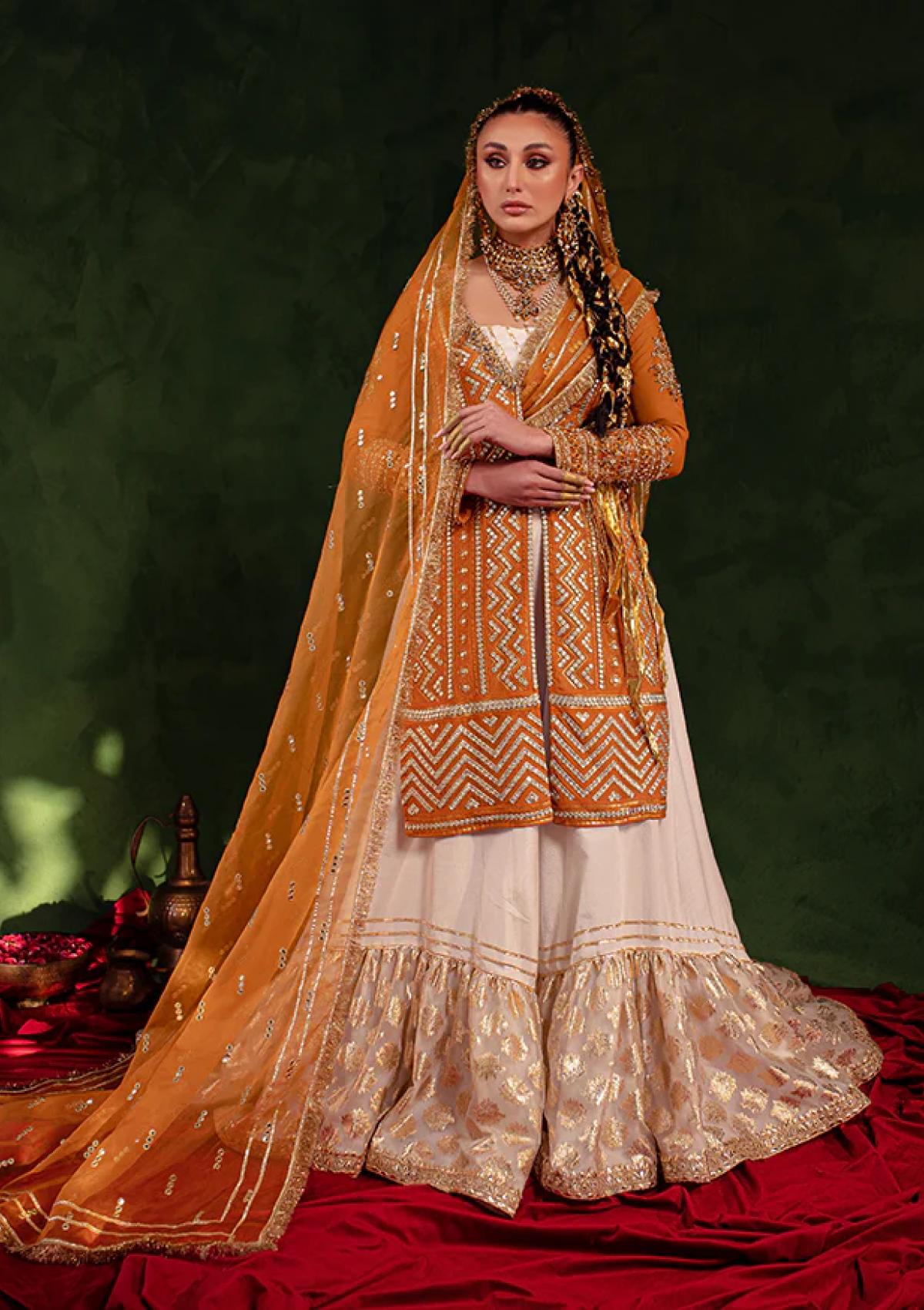 Get ready to welcome the festivities and steal the spotlight with Hijr. A silk blouse detailed with gotta work and a silk farahi garara makes it an ensemble not to miss. The perfect details of embroidered chiffon with tilla, sequins, thread, and pani work is what every fashionista wants in her luxury formal. Style your festive look with an organza dupatta adorned with pani work and gotta. An embellished neckline with mirror, dabka, tilla, and swarovski work creates an overall charismatic look.